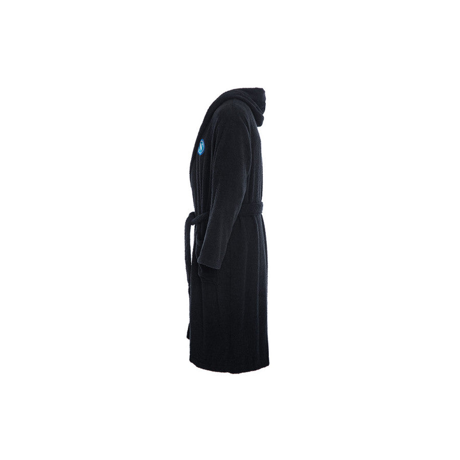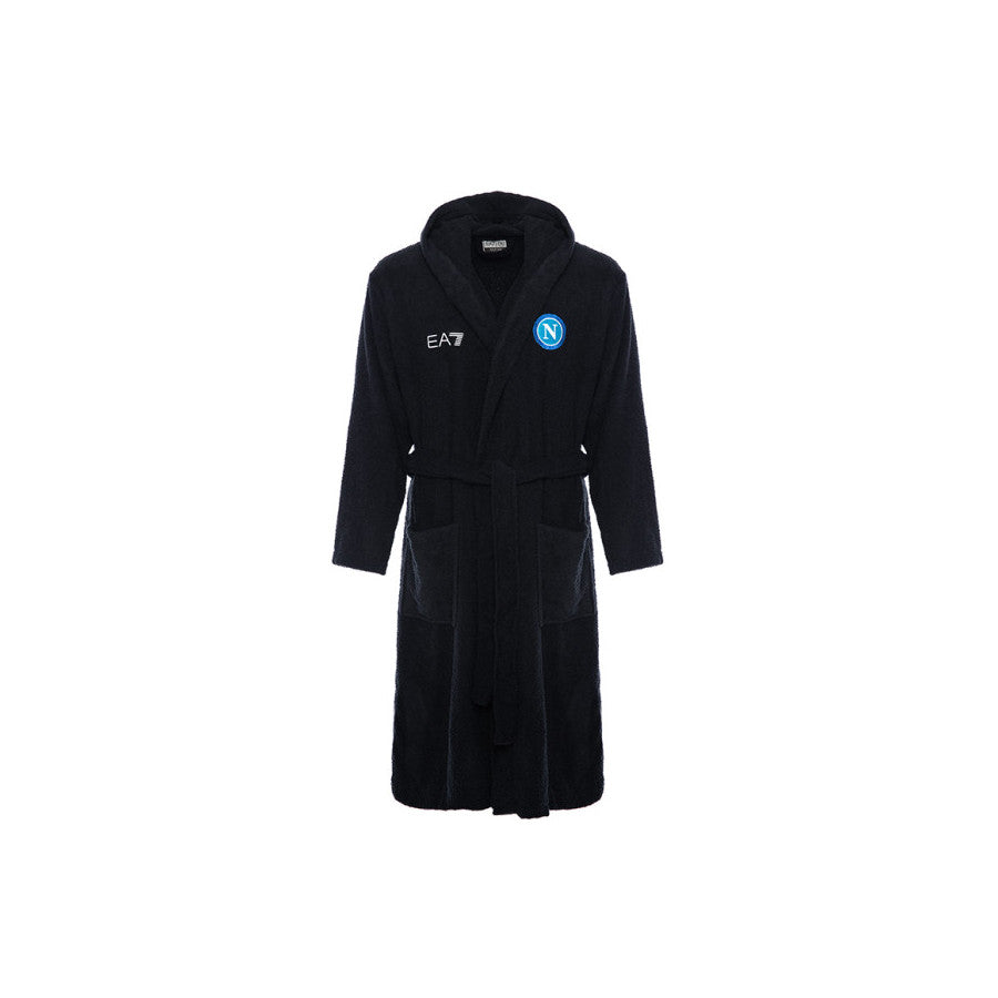 Official SSC Napoli bathrobe for the 2023/2024 season by EA7 Emporio Armani. Made from soft black cotton terry with embroidered EA7 logo on the right chest and SSC Napoli crest on the left. Features hood, waist belt, and front pockets for maximum comfort and absorbency. Stylish and practical for all Napoli fans.