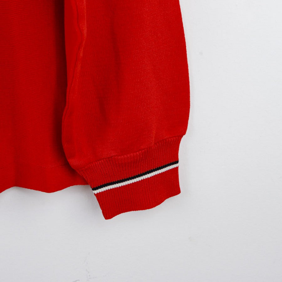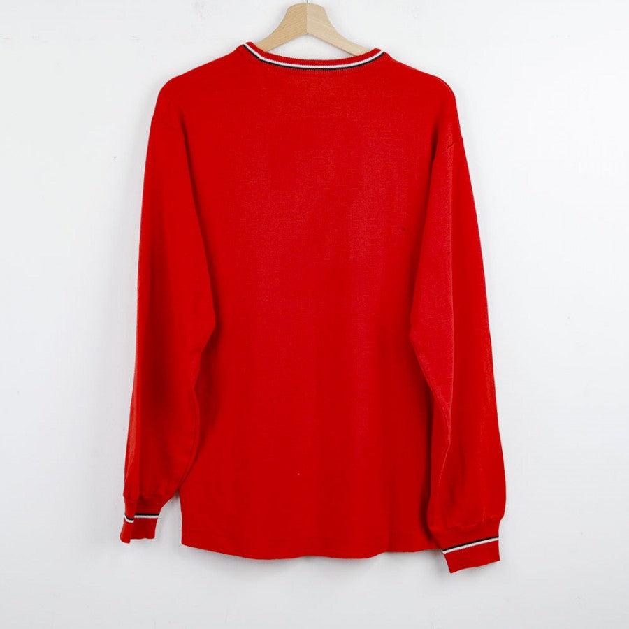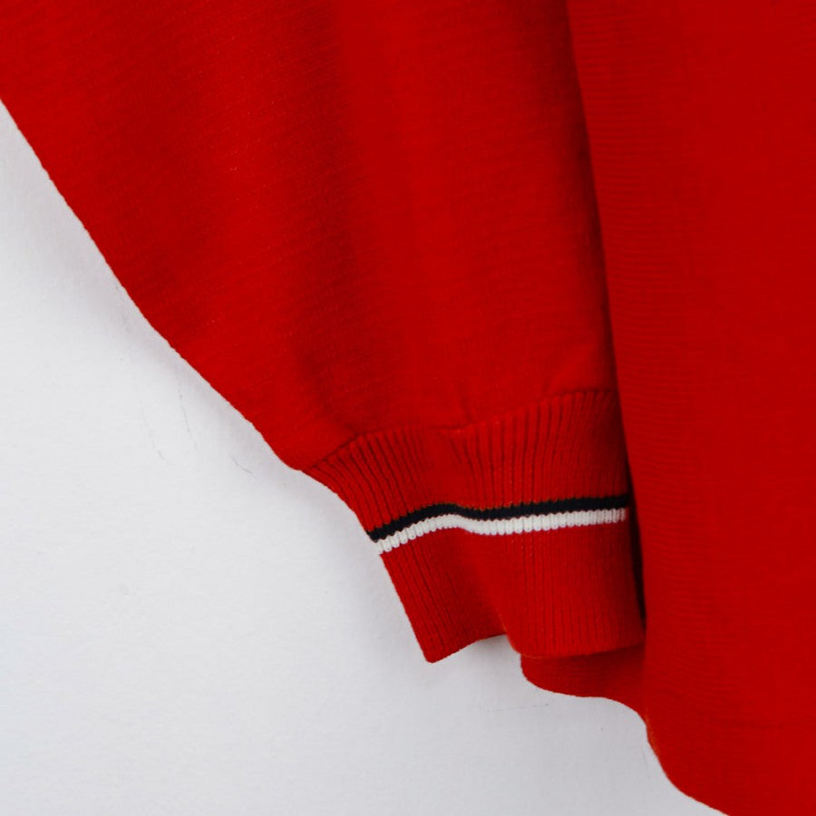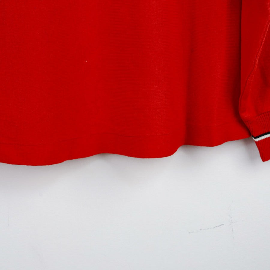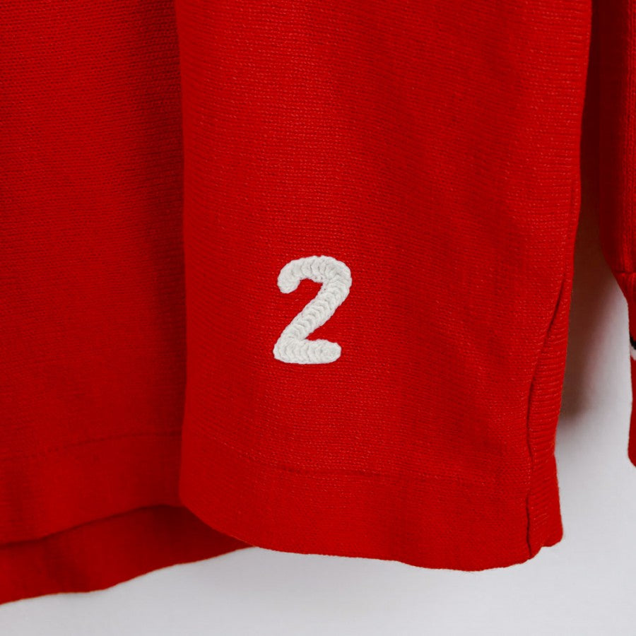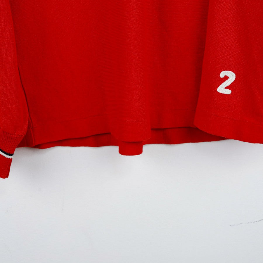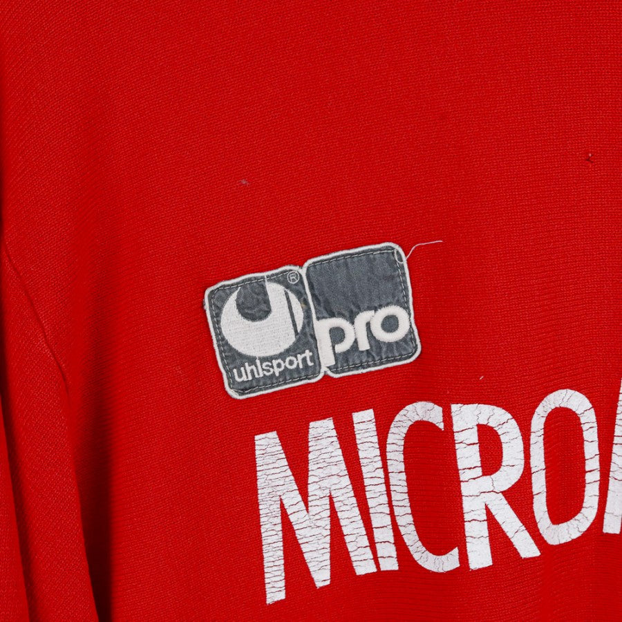 Official training jersey of Ascoli Calcio for the 1987/1988 season, produced by technical sponsor Uhlsport. The long-sleeved jersey is presented in vibrant red with the Uhlsport logo next to the club crest and the Micromax commercial sponsor placed centrally. Details include a collar and cuffs finished with contrasting white and black lines, completing the design. The number 2 is applied on the lower right edge, making it a unique piece for collectors and vintage football enthusiasts.