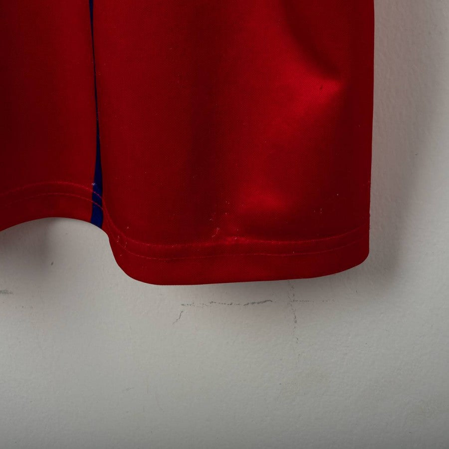 Official Bologna FC 1909 training shirt from the 2000/2001 season, made by Macron. It features a vivid red base with bold blue and white geometric details on the sleeves. The front shows the Macron logo, Area Banca sponsor, and “BOLOGNA FC 1909” lettering. The back continues the same graphic style with large Macron and sponsor logos. Classic collar with contrast inserts. Size XL, in excellent condition. A must-have item for collectors and Bologna fans.