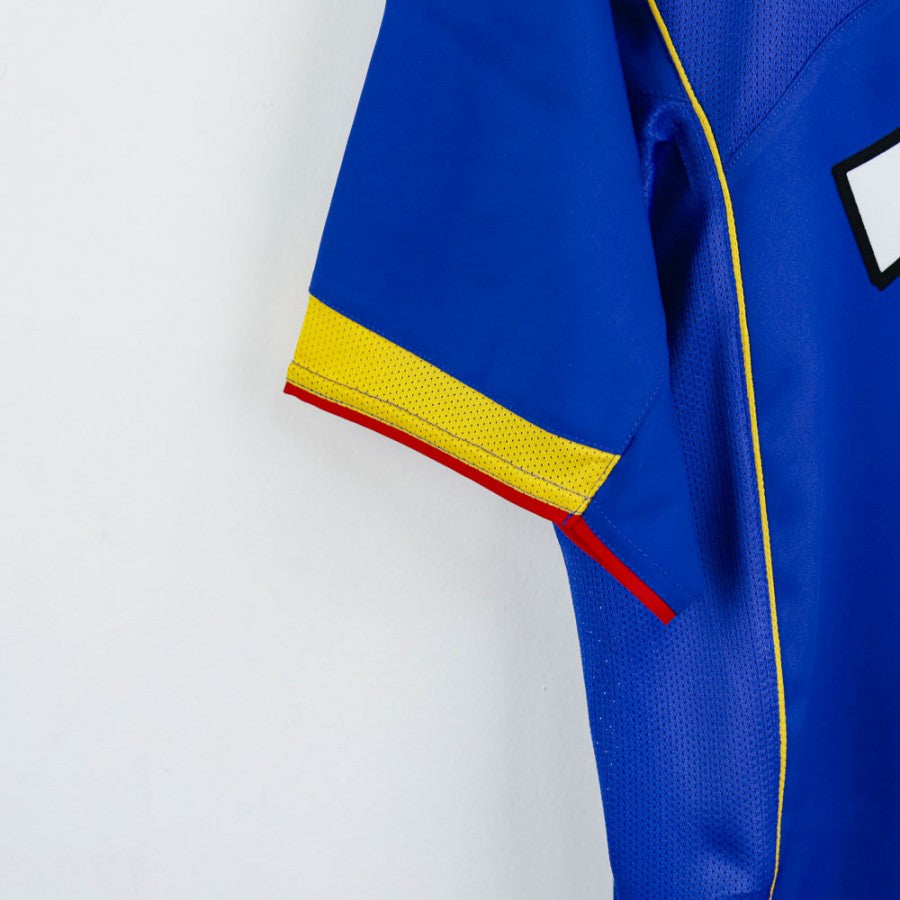 Official Arsenal Away jersey for the 2004/2005 season, produced by Nike and customized with Thierry Henry's name and number 14. The jersey features a striking blue color with yellow and red accents, embodying Arsenal’s vibrant away style. The Nike logo is displayed on the chest, with the Arsenal crest over the heart. The O2 commercial sponsor stands out in the center, giving the jersey a sleek, modern look. Size S.