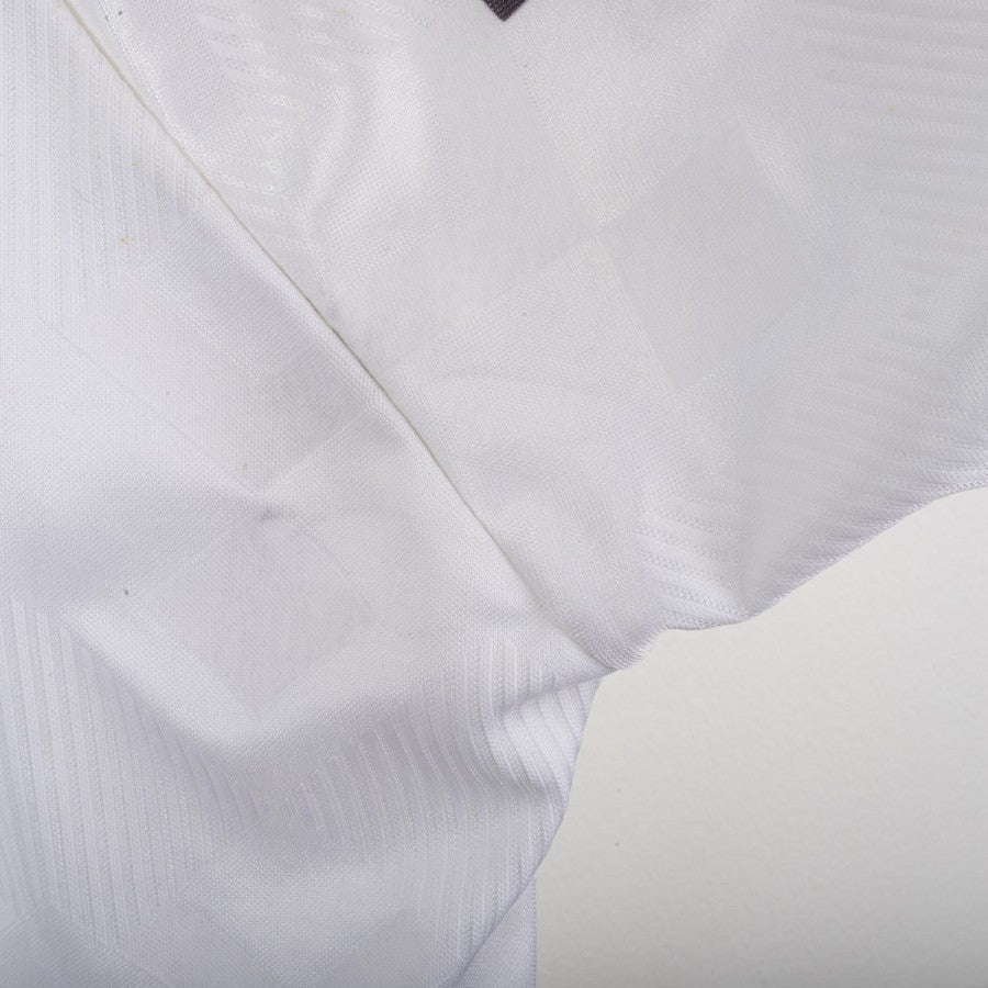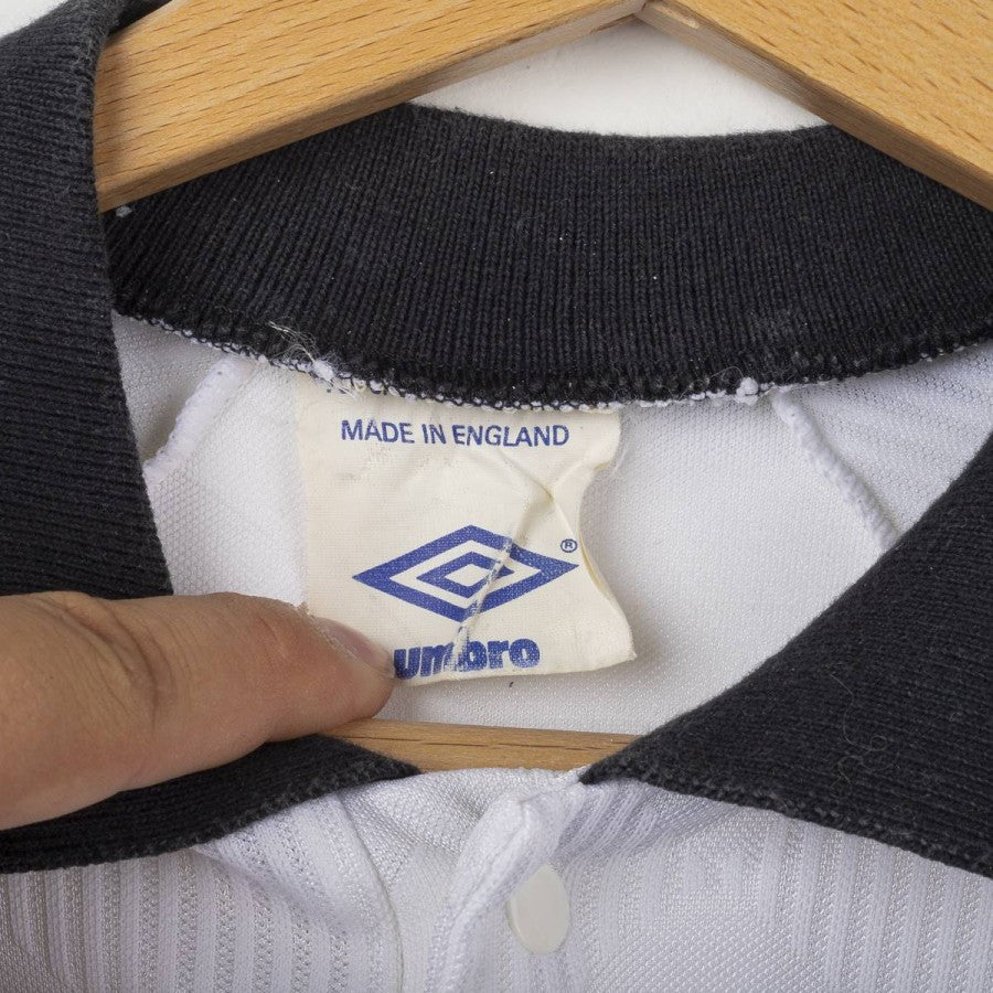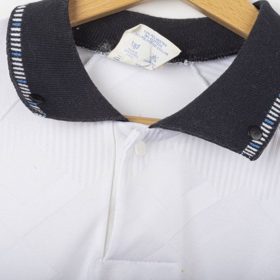 Aston Villa away shirt from the 1990/1991 season, made by Umbro. White model with black and light blue details on the sleeves and a black polo collar with blue and white trim. Embroidered Aston Villa crest on the left chest and stitched Umbro logo on the right. Mita Copiers sponsor flocked in black on the front. Lightweight fabric with jacquard geometric pattern. Classic fit. Size L.