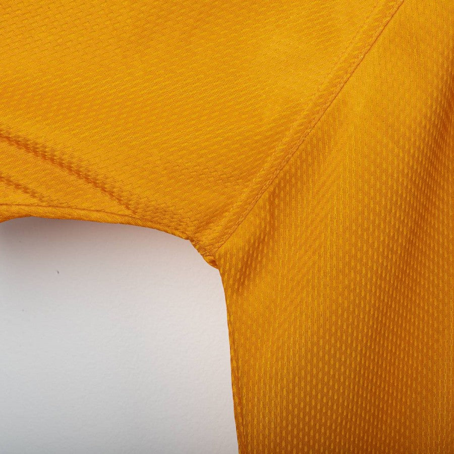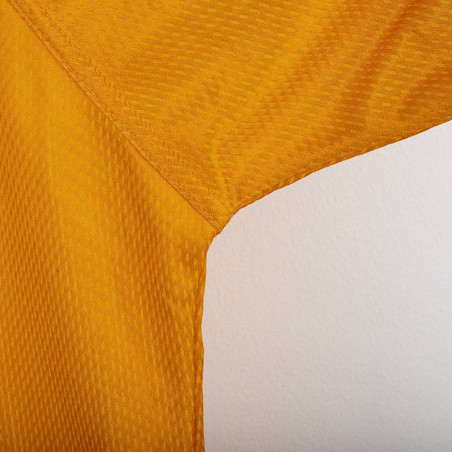 Barcelona away shirt from the 1997/1998 season, produced by Kappa in the “Gara – Official Pro Equipment” line. Orange base with blaugrana vertical stripes, crew neck collar with red and blue trim. Embroidered Kappa logo on the chest, Barcelona crest stitched on the left chest, and sublimated “Barça” lettering under the collar. Giovanni 10 printed name and number on the back with integrated Kappa logo. Sleeves with repeated Kappa logos. An iconic shirt from the Kappa era, worn during the La Liga winning season under Van Gaal. Size M.