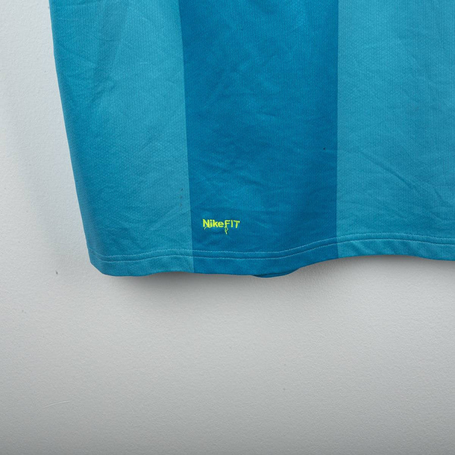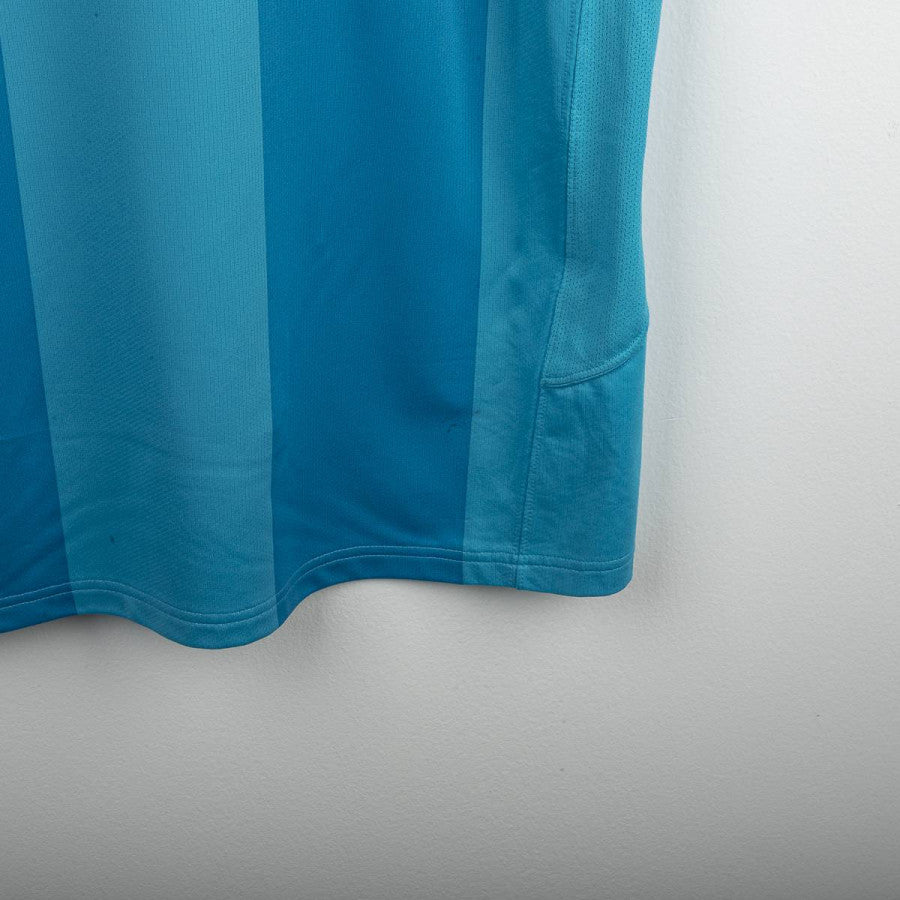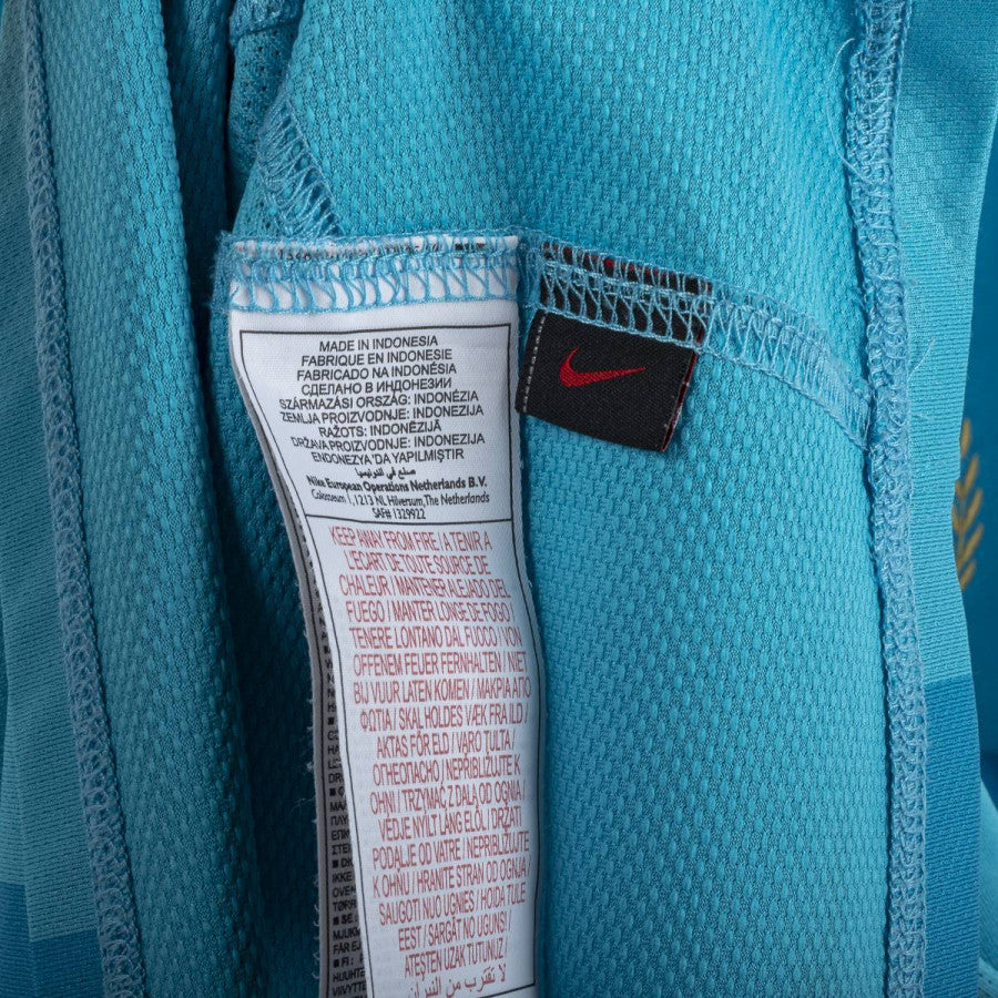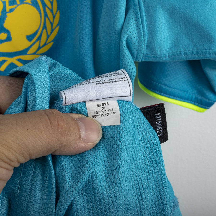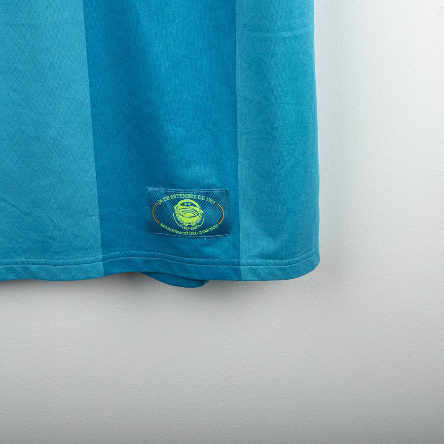Barcelona away shirt from the 2007/2008 season, made by Nike. Light blue design with neon yellow details and tonal vertical stripes. Embroidered Barça crest on the left chest with special Camp Nou 1957-2007 celebration detail. Yellow Nike swoosh embroidered on the right chest. Unicef sponsor printed in yellow on the front. Official LFP patch stitched on the right sleeve. Henry name and number 14 printed in yellow on the back. Inside collar detail with “Més que un club” motto. Regular fit, size XL.