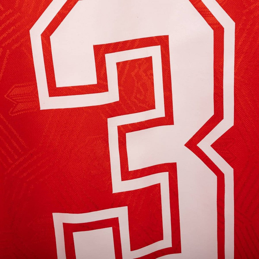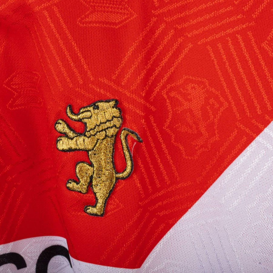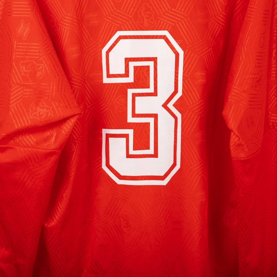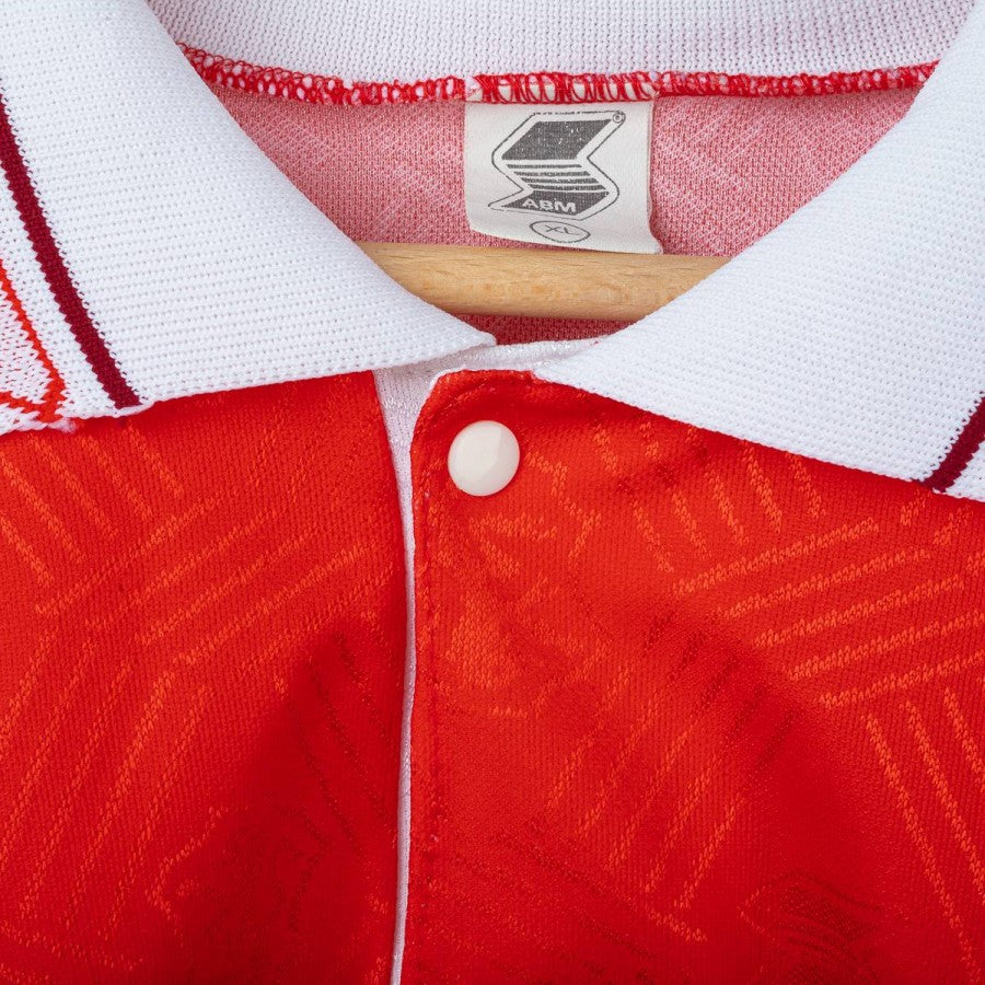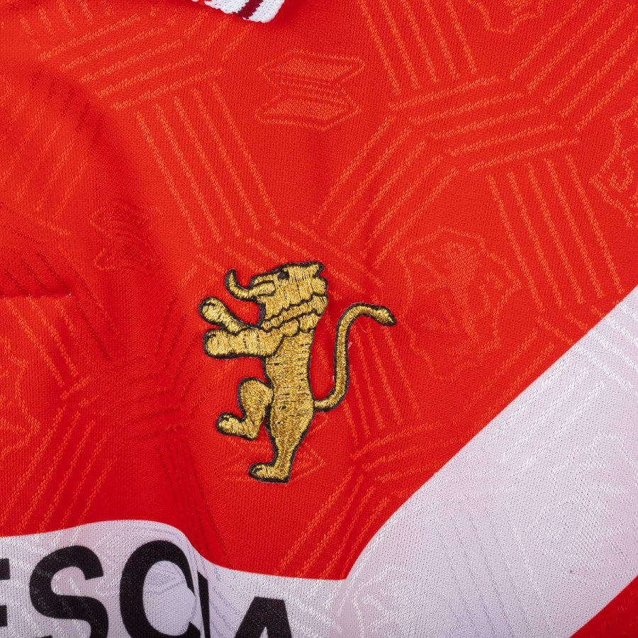 Brescia away shirt from the 1996/1997 season, made by ABM. Long sleeve version in bright red with a large white V across the chest and white details on collar and cuffs. Embroidered ABM logo on the right chest, stitched golden lion crest on the left chest. Printed Brescia Lat sponsor in black across the front. Official number 3 applied on the back. Made of lightweight breathable technical fabric. Size XL.