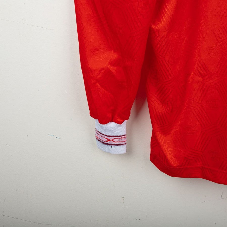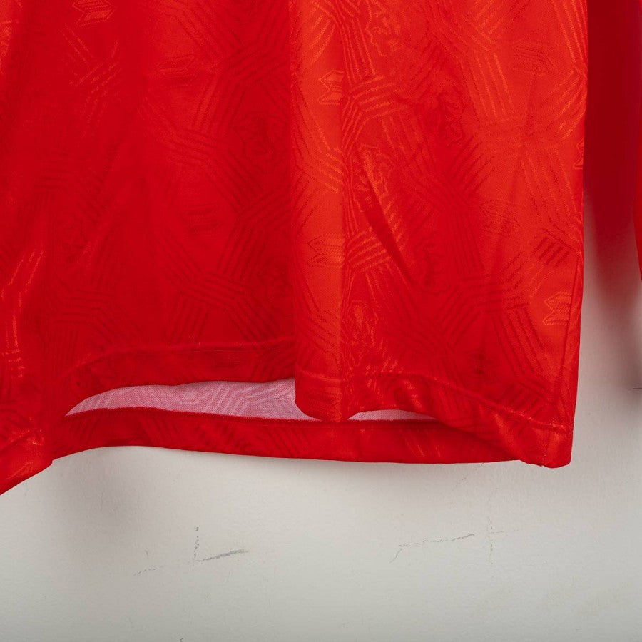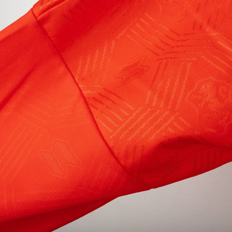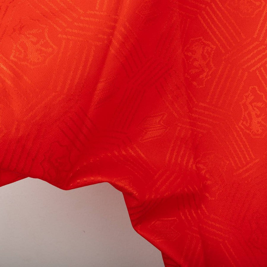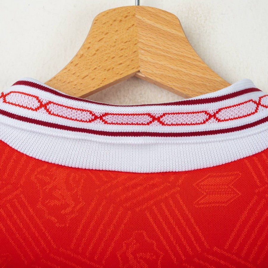 Brescia away shirt from the 1996/1997 season, made by ABM. Long sleeve version in bright red with a large white V across the chest and white details on collar and cuffs. Embroidered ABM logo on the right chest, stitched golden lion crest on the left chest. Printed Brescia Lat sponsor in black across the front. Official number 3 applied on the back. Made of lightweight breathable technical fabric. Size XL.