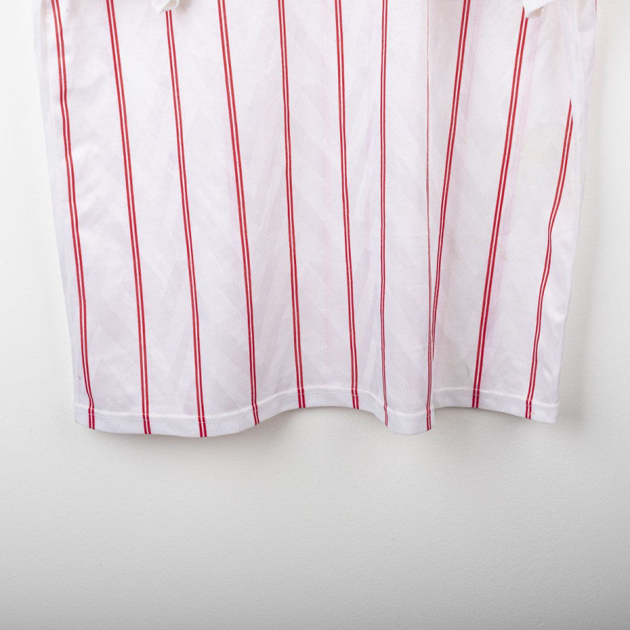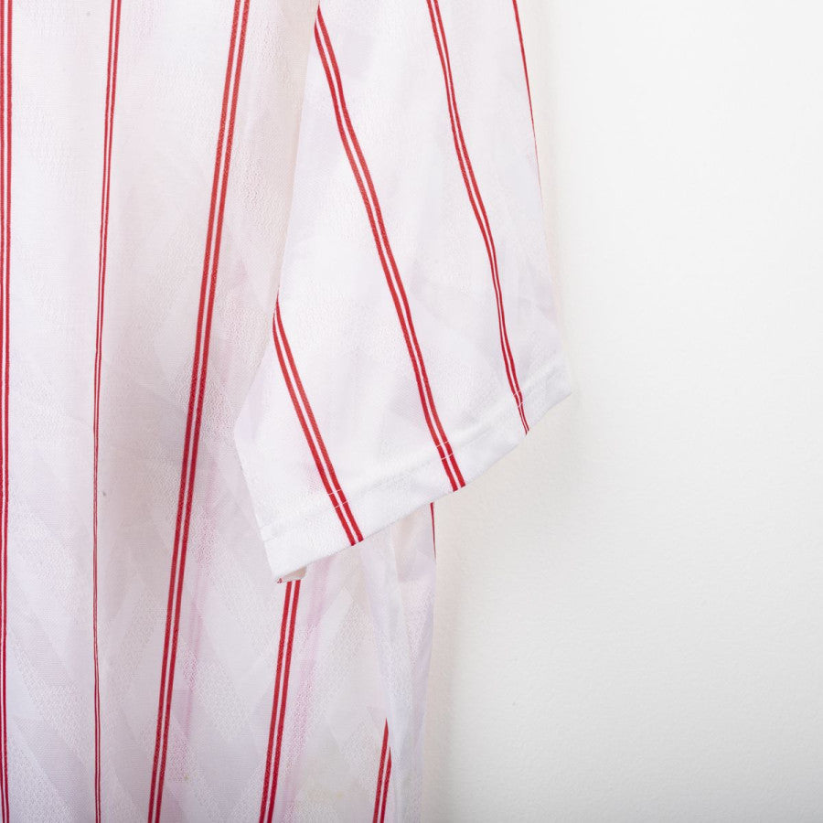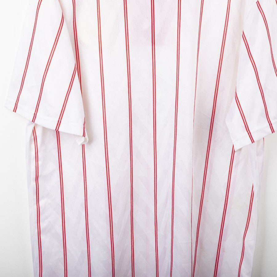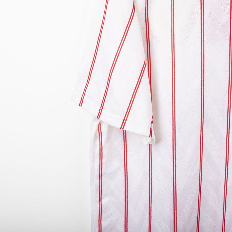 Chelsea away shirt from the 1991/1992 season, made by Umbro. White design with thin vertical red stripes, blue collar and red lace-up neckline. Embroidered CFC crest on the left chest and stitched Umbro logo on the right. Commodore sponsor flocked on the front. Classic fit, lightweight breathable fabric. Size XL. An iconic vintage shirt worn by the Blues in the early 90s, during their final years in the First Division before the Premier League era.