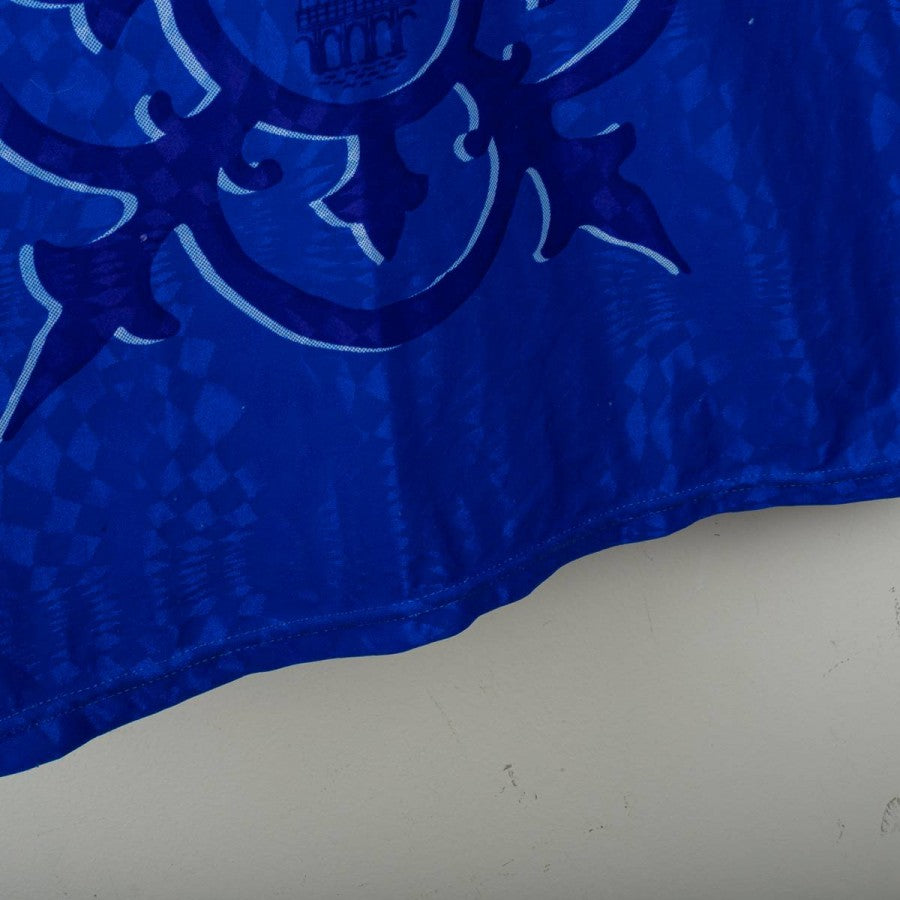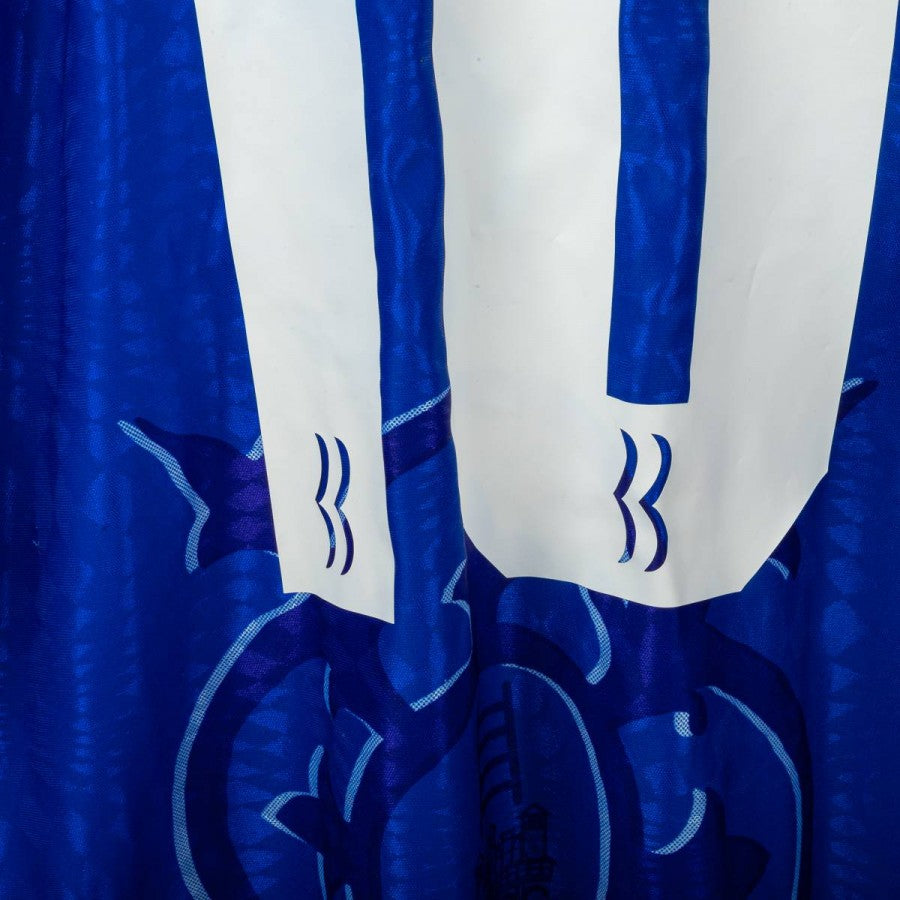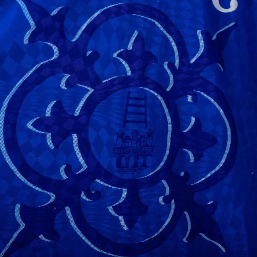 Chievo Verona Away shirt from the 1998/1999 season, made by Biemme. Blue color with yellow details on collar and sleeve edges. Stitched Chievo crest on the chest, embroidered Biemme logo on the right, and printed Paluani sponsor at the center. Lega Calcio patch stitched on the right sleeve and Verona’s ladder symbol on the left. On the back, white Corini 10 personalization. Polo-style collar with buttons. Made of lightweight breathable technical fabric. Historic shirt, worn in Serie B season.