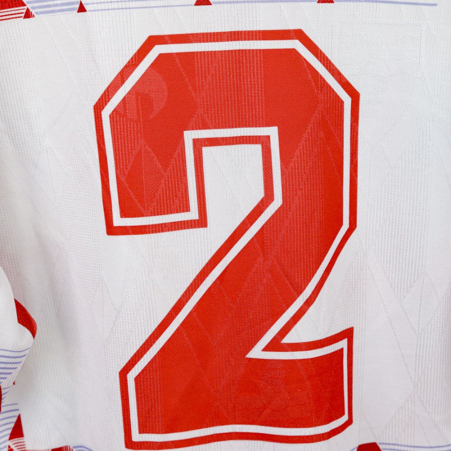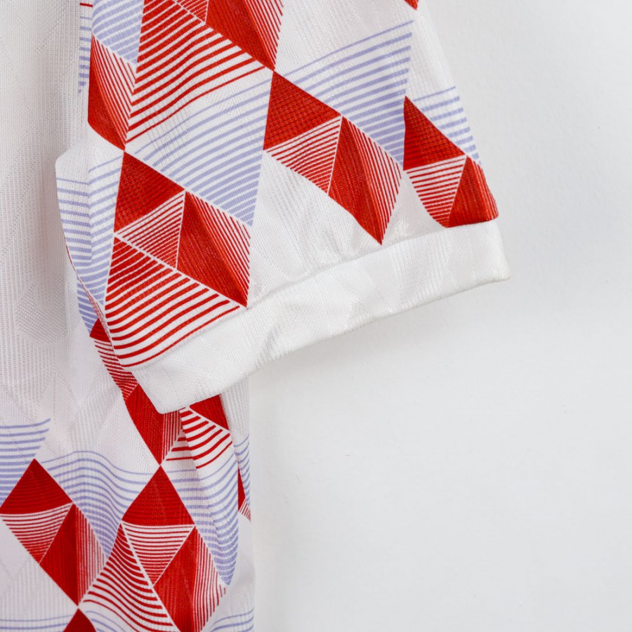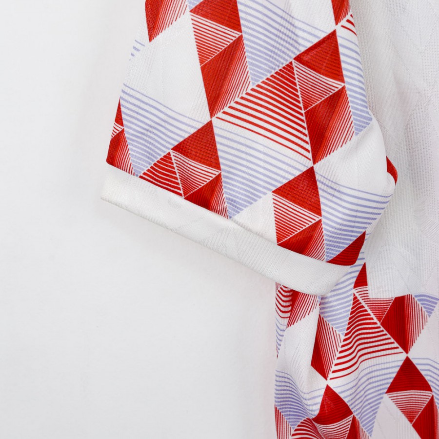 The official Cremonese Away jersey for the 1993/1994 season, produced by technical sponsor Uhlsport, features a distinctive geometric pattern of red and white triangles, making it instantly recognizable. The center of the chest showcases the commercial sponsor logo "Moncart," while the Cremonese crest is proudly displayed on the left chest. The back of the jersey displays the number 2 in bold red outlined in white. The collar has a classic design with red and lilac details. The size is XL, perfect for collectors and fans who want to own a piece of the club’s history.