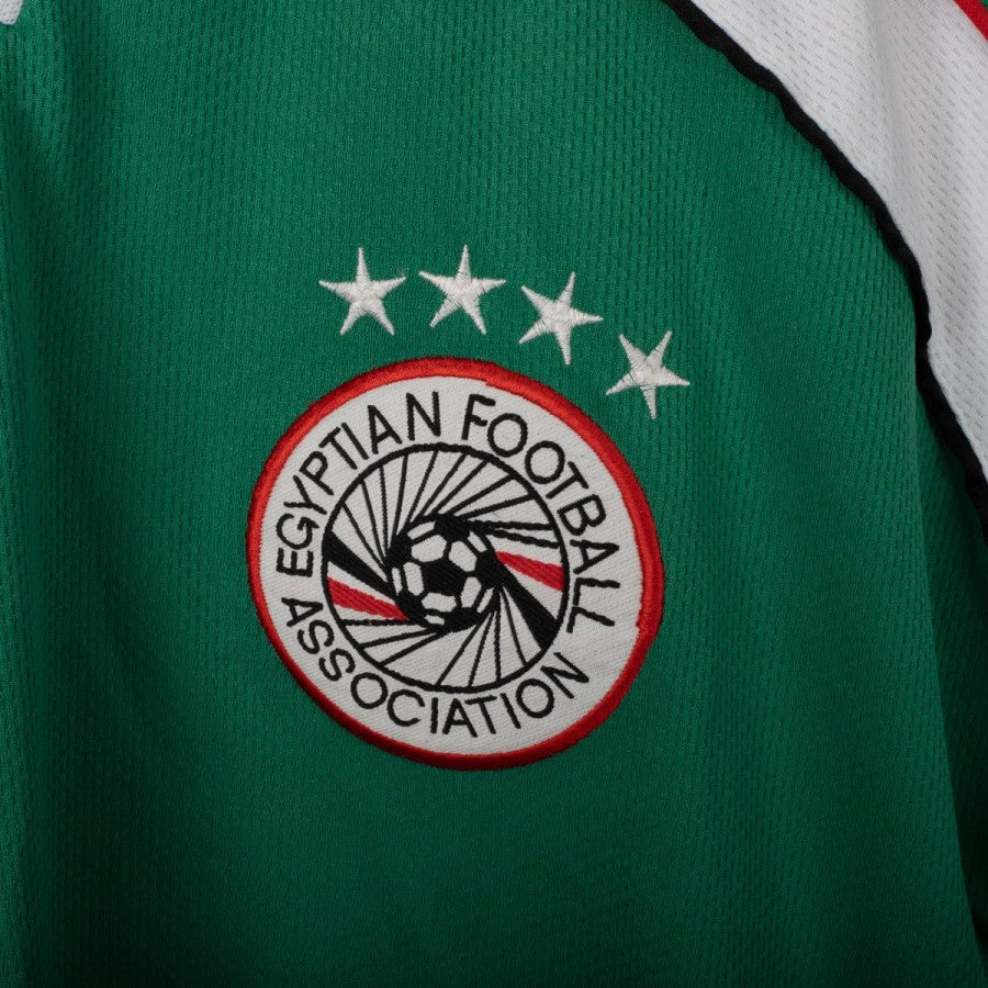 Official away shirt of the Egyptian national team from the 2003/2004 season, made by Puma. Crafted from breathable technical fabric, it features a green base with white, red, and black inserts along the shoulders and sides. The front displays the embroidered Puma logo and Egyptian FA crest, while the national flag is placed under the collar on the back. Size M, excellent condition. A rare find for collectors and fans of African football history.