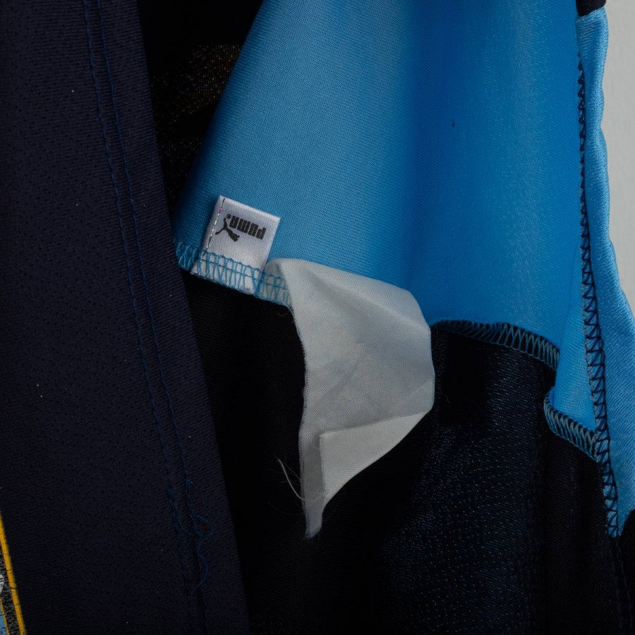 Lazio away European shirt from the 2001/2002 season, made by Puma. Navy blue with sky blue sleeves and details, polo collar in sky blue with white trim. White embroidered Puma logo on the right chest, stitched S.S. Lazio crest on the left. SIEMENS mobile sponsor printed in white and red on the front. On the back, “Crespo” name and number 10 in white with black outline. Size XL.