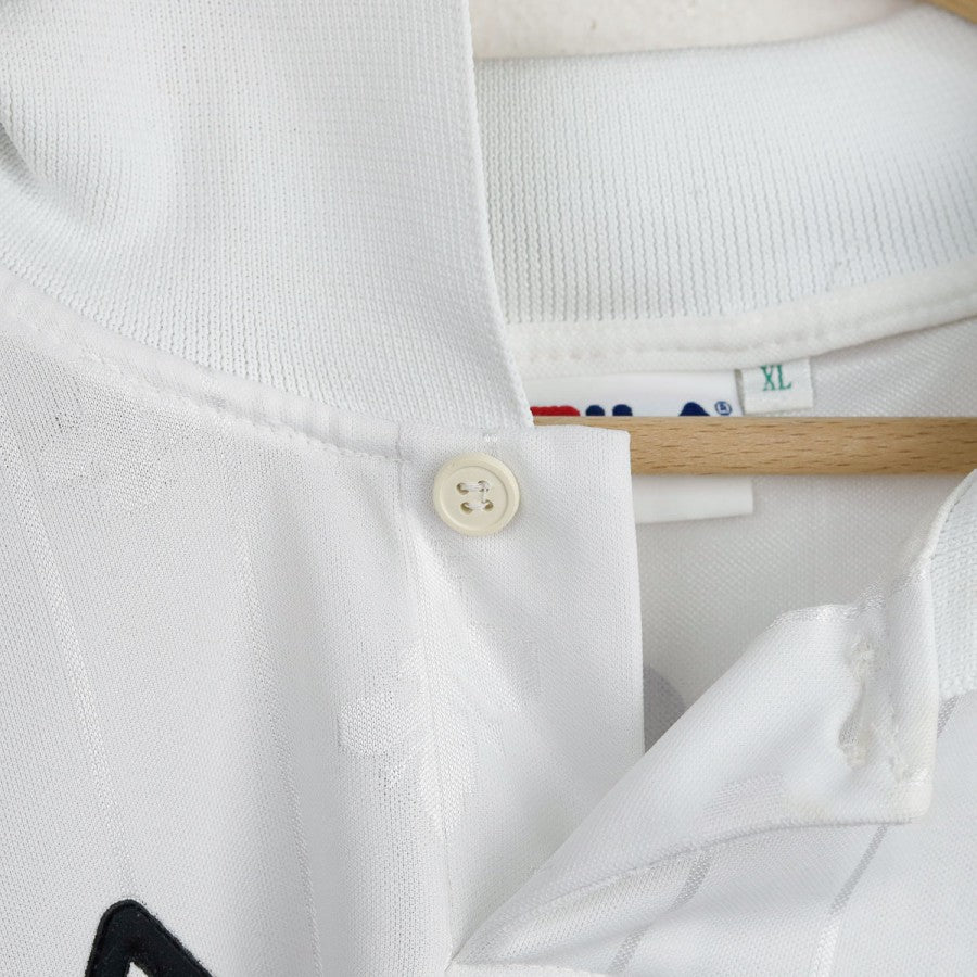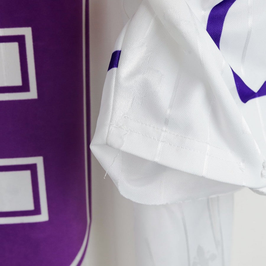 1997/1998 Away Fiorentina Shirt Fila Batistuta 9. This away shirt from Fiorentina’s 1997/1998 season was made by Fila and features a white base with elegant tone-on-tone fleur-de-lis motifs and purple accents on the sleeves, collar, and number. The front displays Fila branding alongside commercial sponsors Giocheria and Nintendo. On the back, the iconic number 9 and Batistuta’s name pay tribute to one of Fiorentina’s greatest ever players.