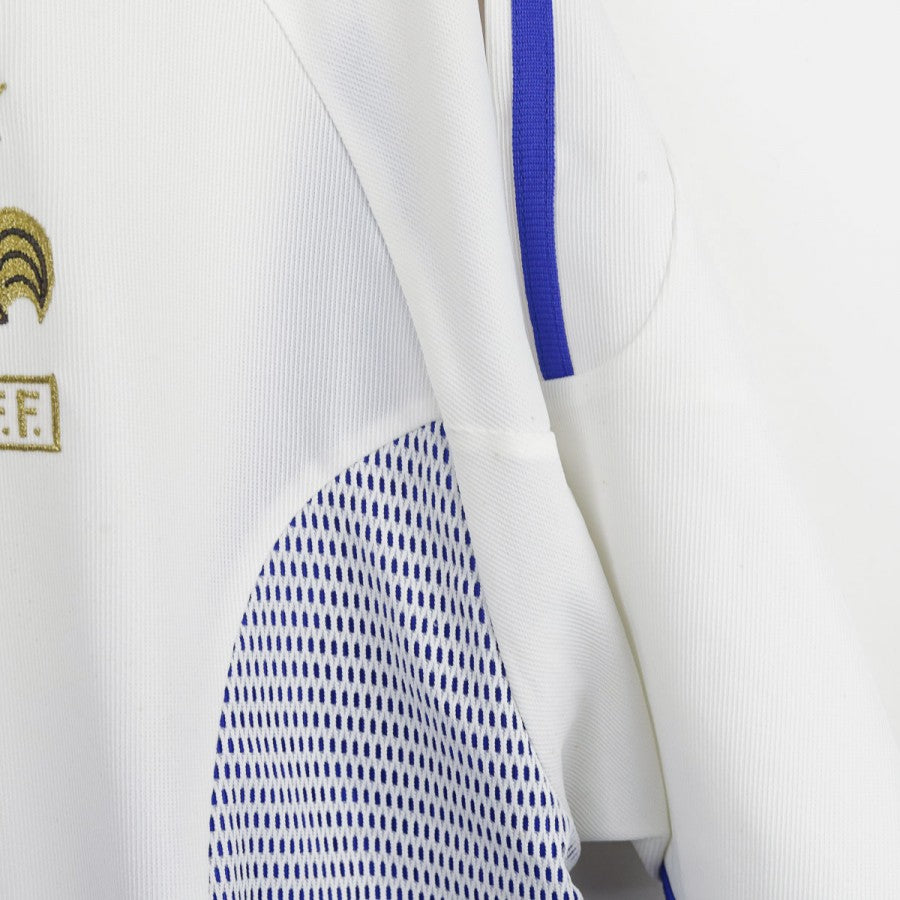Away jersey of the French national team for the 2002/2003 season, made by technical sponsor Adidas. The design features a clean white base with blue and red details on the shoulders and sleeves, reflecting the French tricolour. The Adidas logo is stitched at the center of the chest, while the FFF crest with a star is placed on the left side. On the back, Zidane's name and number 10 are printed in blue. The shirt is size XL, as shown on the label.