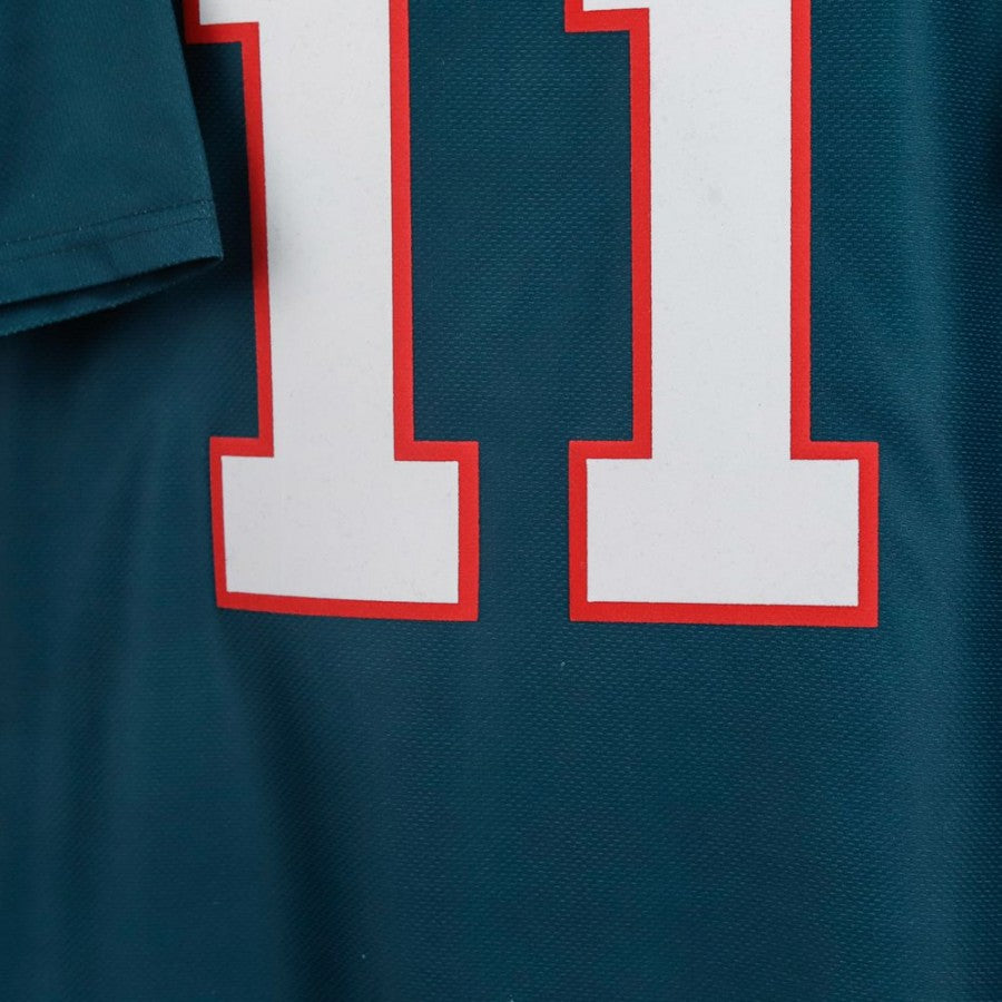 Official away jersey of the Wales national team for the 1995/1996 season, crafted by technical sponsor Umbro. This jersey stands out with its unique design featuring a dark green base with white and red curved graphic elements across the front, giving it a modern and striking look. The Welsh Football Association crest is stitched on the chest, alongside the Umbro logo in white. On the back, the personalization displays the name "Giggs" and number 11 in white with a red outline, a tribute to the iconic player Ryan Giggs. Size XL.