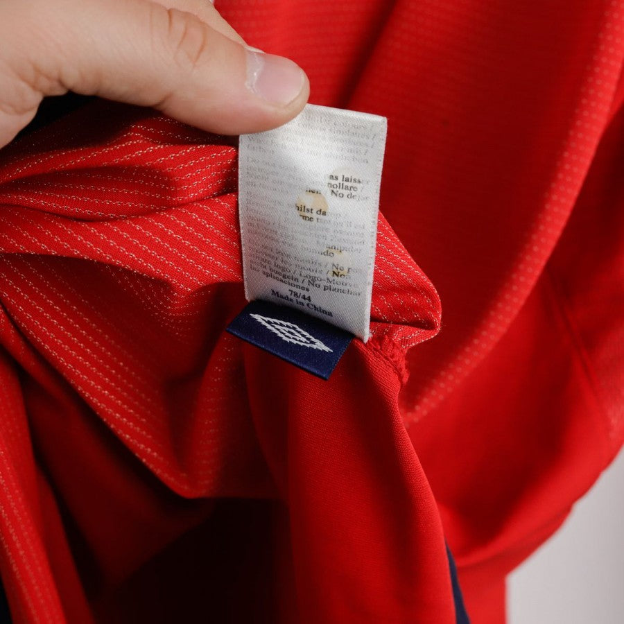 Official England away shirt from the 2004 season, produced by Umbro and personalized with the name Beckham and number 7. The shirt features a red design with the FA crest and a gold star above it, representing England's 1966 World Cup triumph. The Umbro logo is embroidered on the right chest. On the back, "Beckham" and number 7 are printed in white. This long-sleeve version is made from breathable technical fabric and is size L.