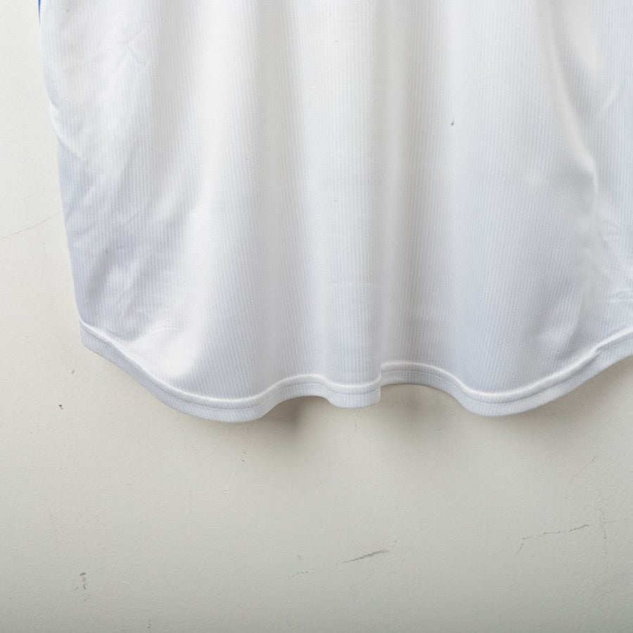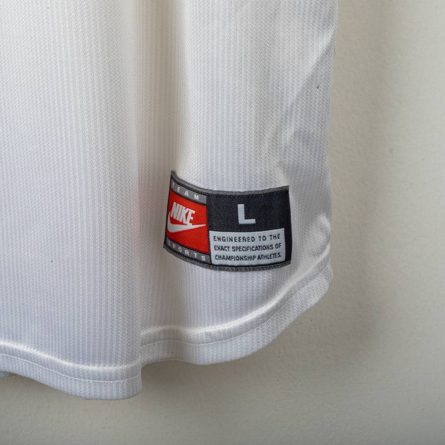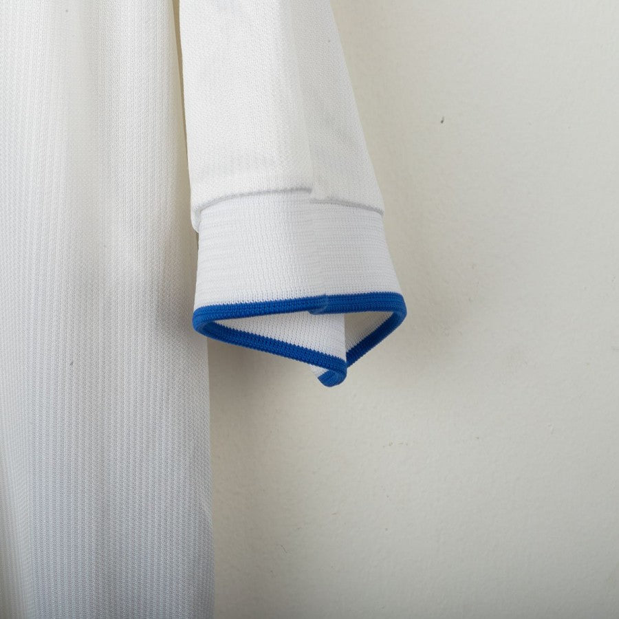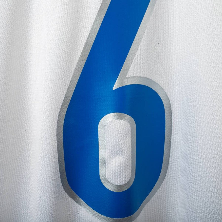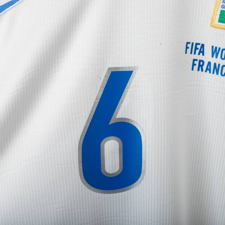 1998 Away Italy shirt by Nike featuring Alessandro Nesta’s name and number 6 on the back, size L. The design includes a white base with blue accents, polo-style collar, and the official France ’98 World Cup patch on the chest. The Nike logo is present both on the front and the inner tag. A little fact: this World Cup marked Nesta’s first appearance in the tournament, although it ended early due to an injury against Austria in the round of 16.