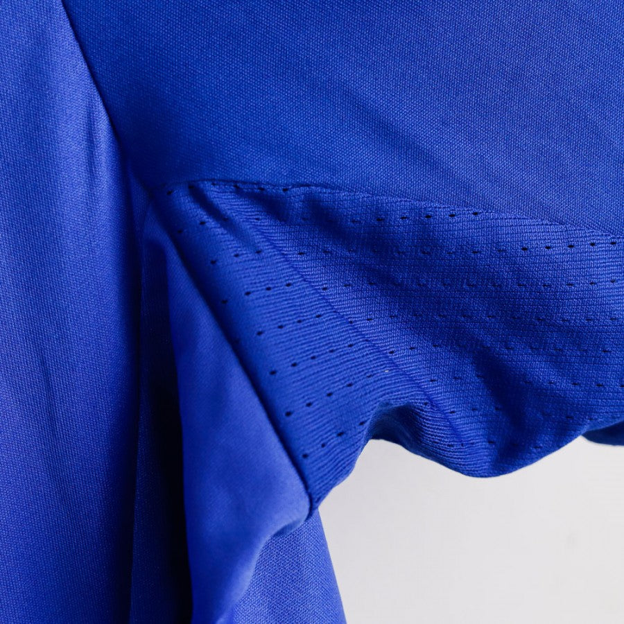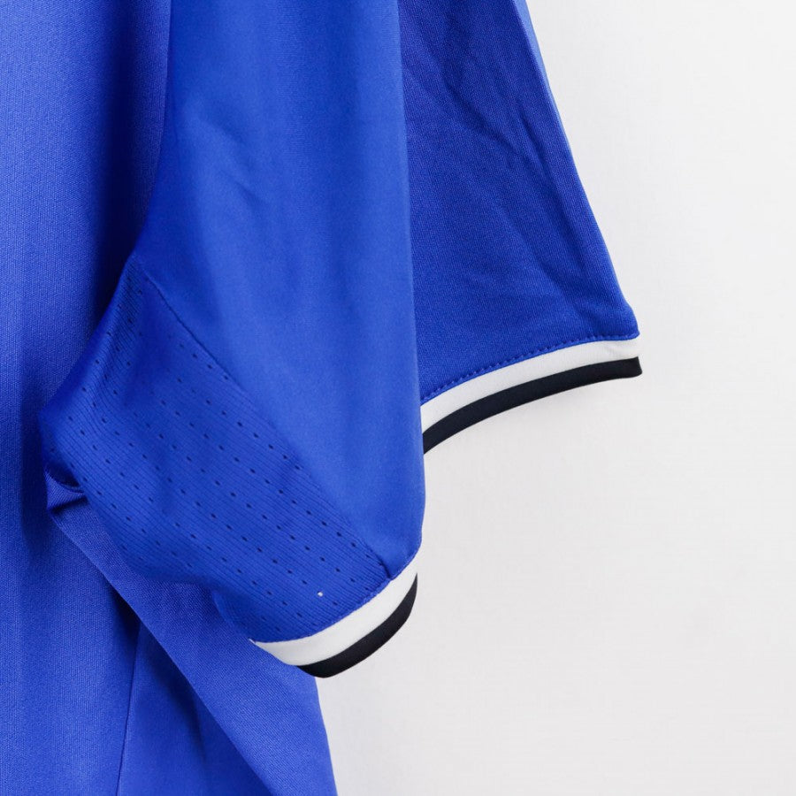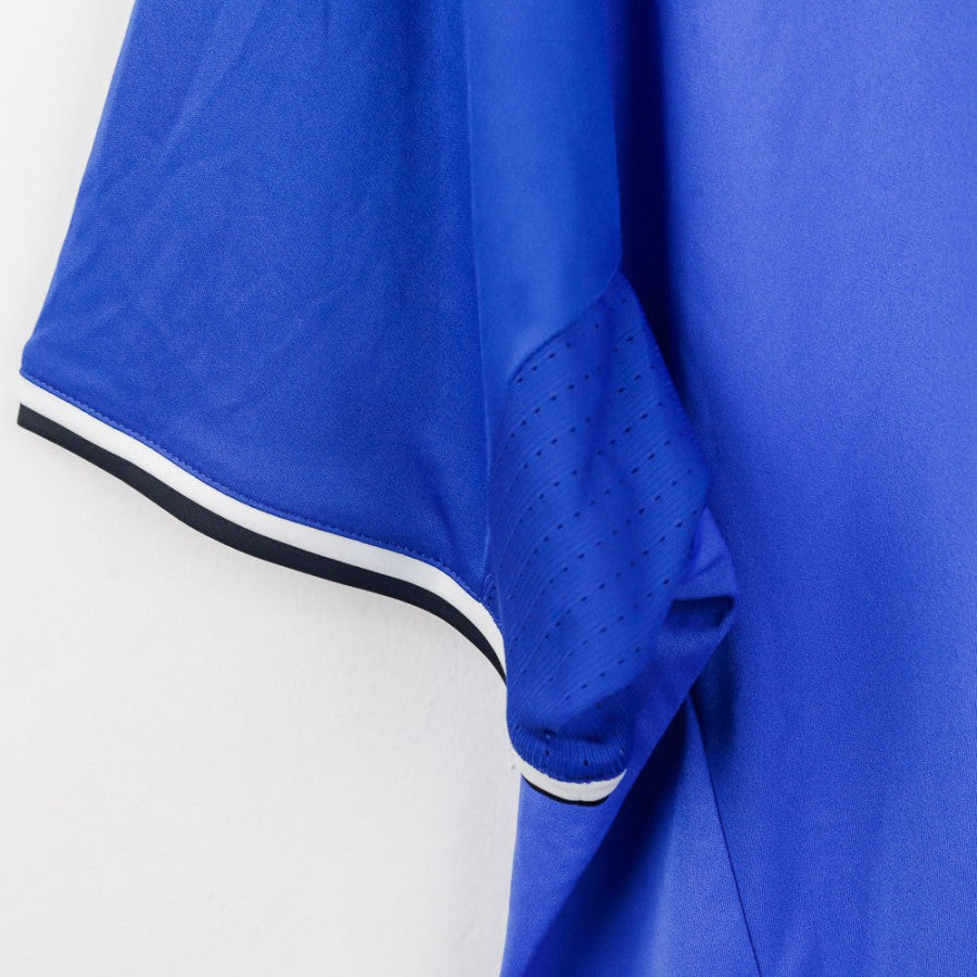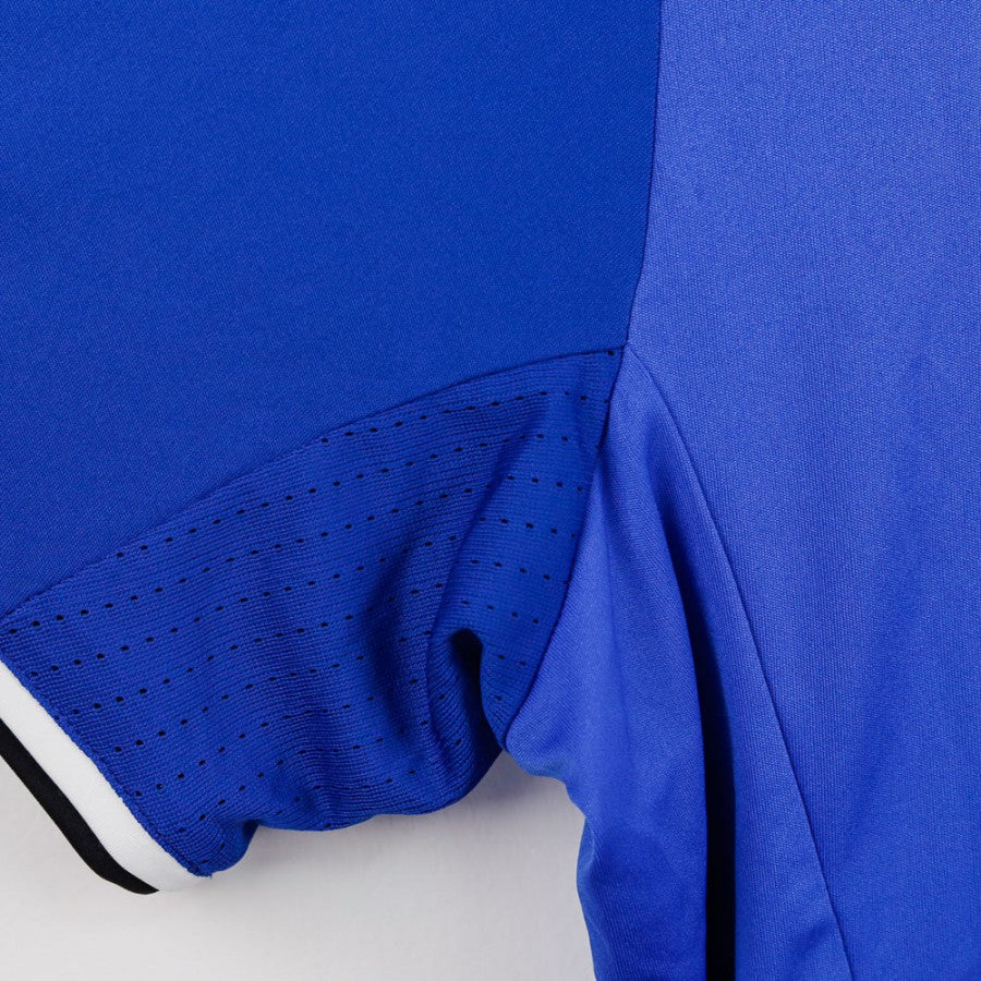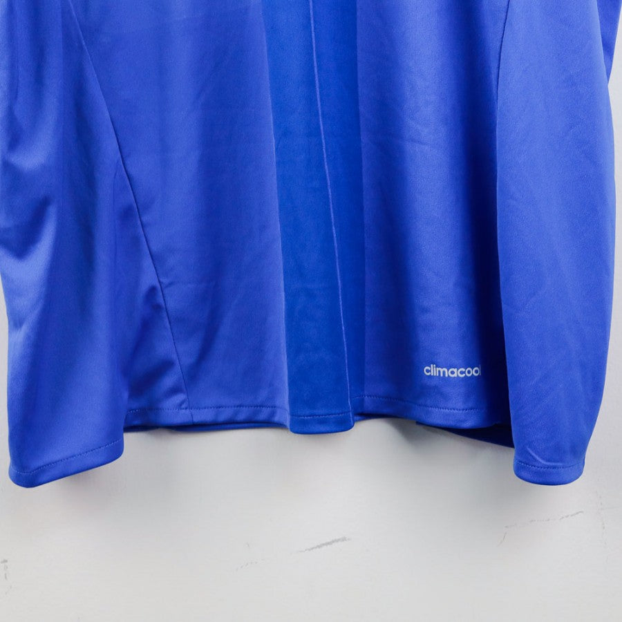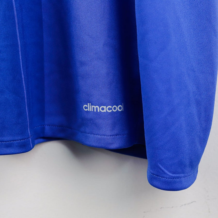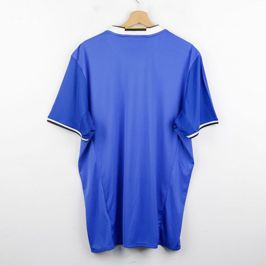 Juventus away jersey for the 2016/2017 season, produced by Adidas. The design features a blue base with white and black details on the collar and sleeves. The Adidas logo, Juventus crest with three stars, and the Italian scudetto are on the chest, with Jeep as the main sponsor. Climalite technology ensures maximum comfort. Size XL.