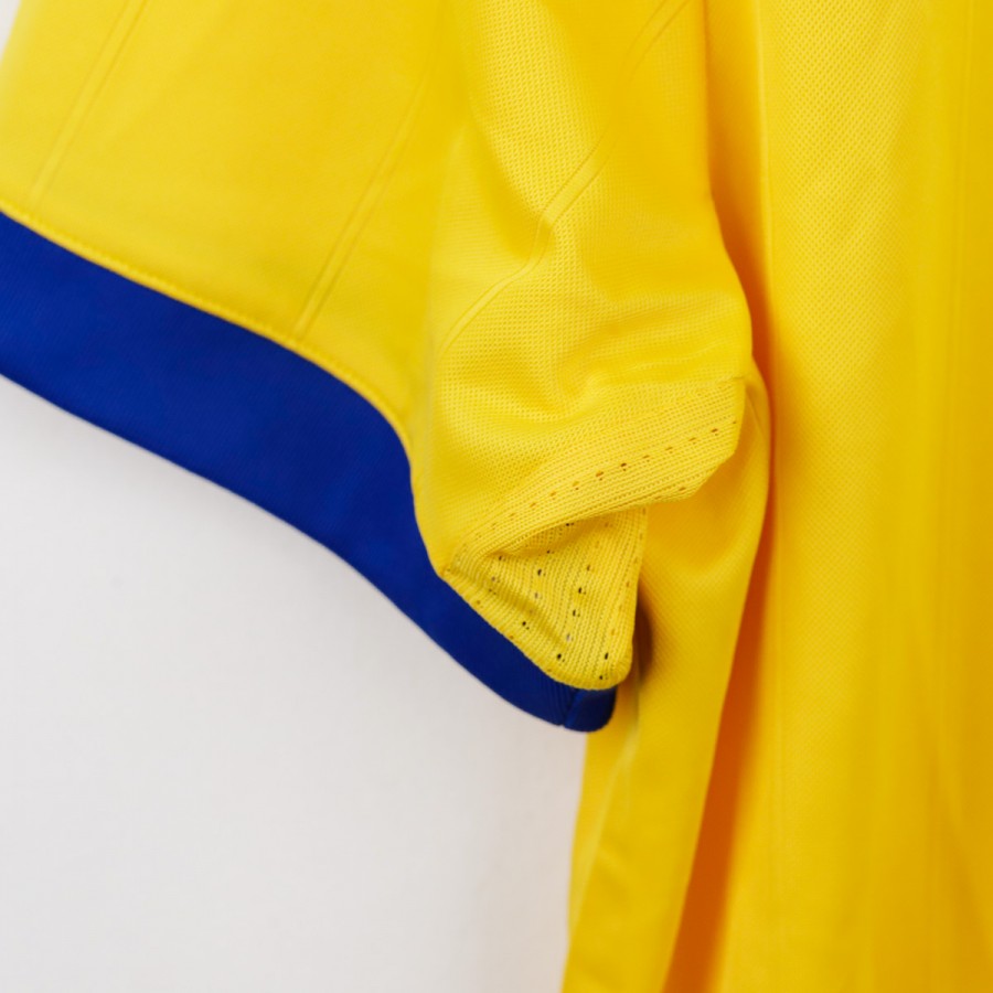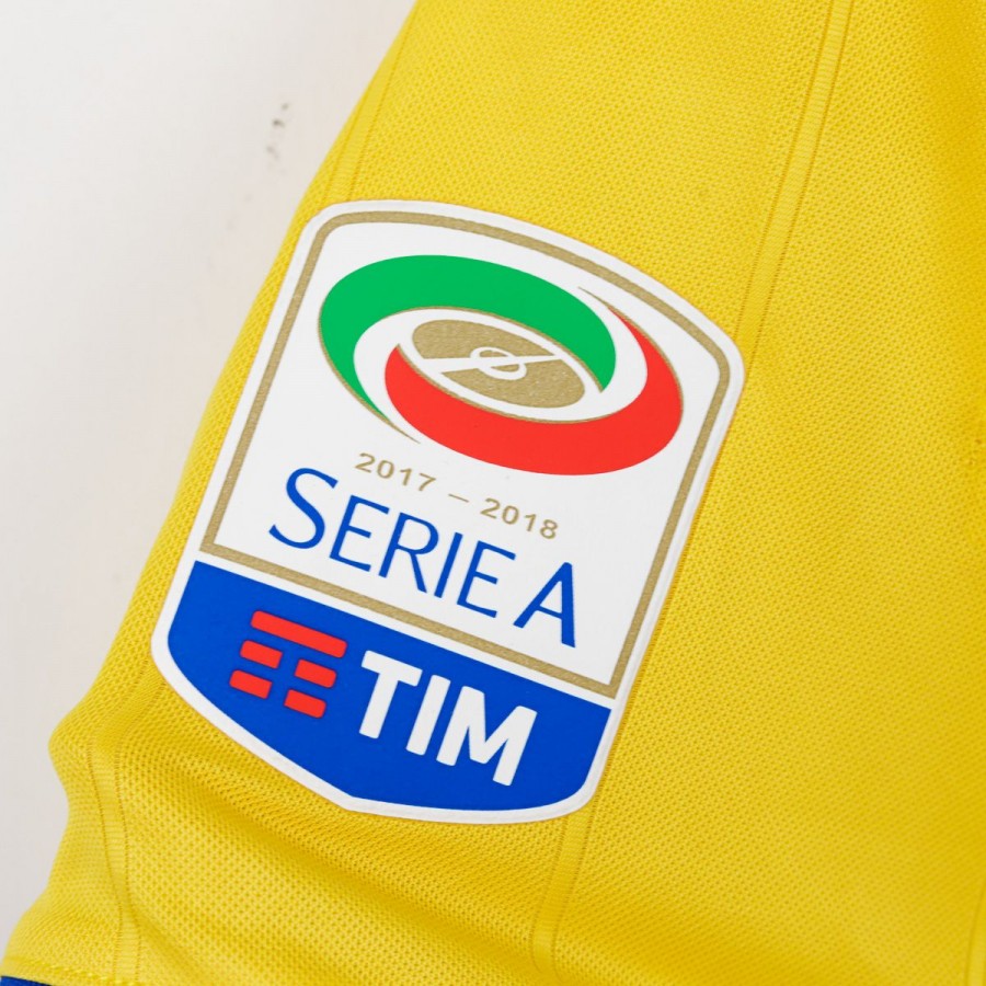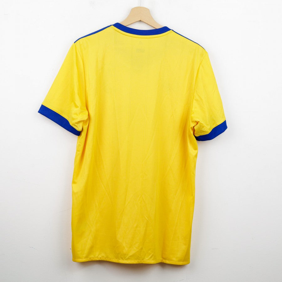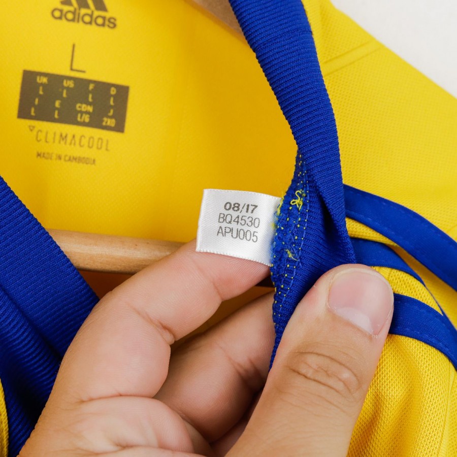Juventus away shirt from the 2017/2018 season made by Adidas. The technical sponsor Adidas is featured on the chest along with the commercial sponsor Jeep. A Serie A sleeve patch is applied on the left arm. The shirt stands out for its bold gold and royal blue design, with three stars above the club crest to commemorate the 30 Serie A titles. Size L with original tag still attached.