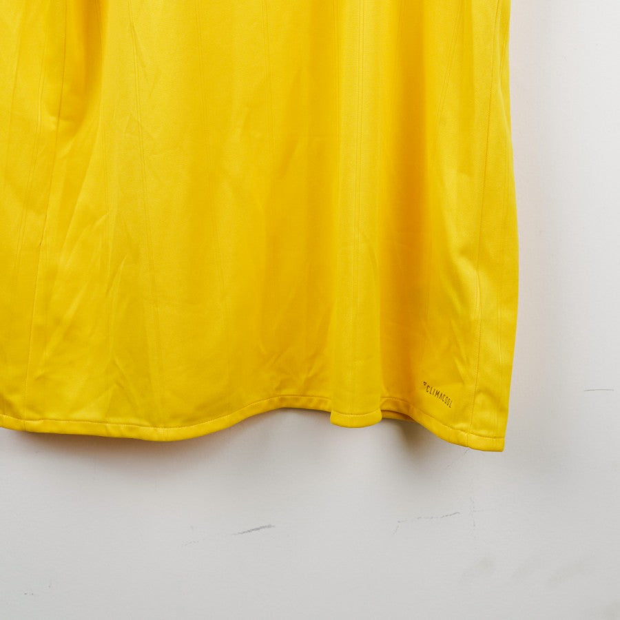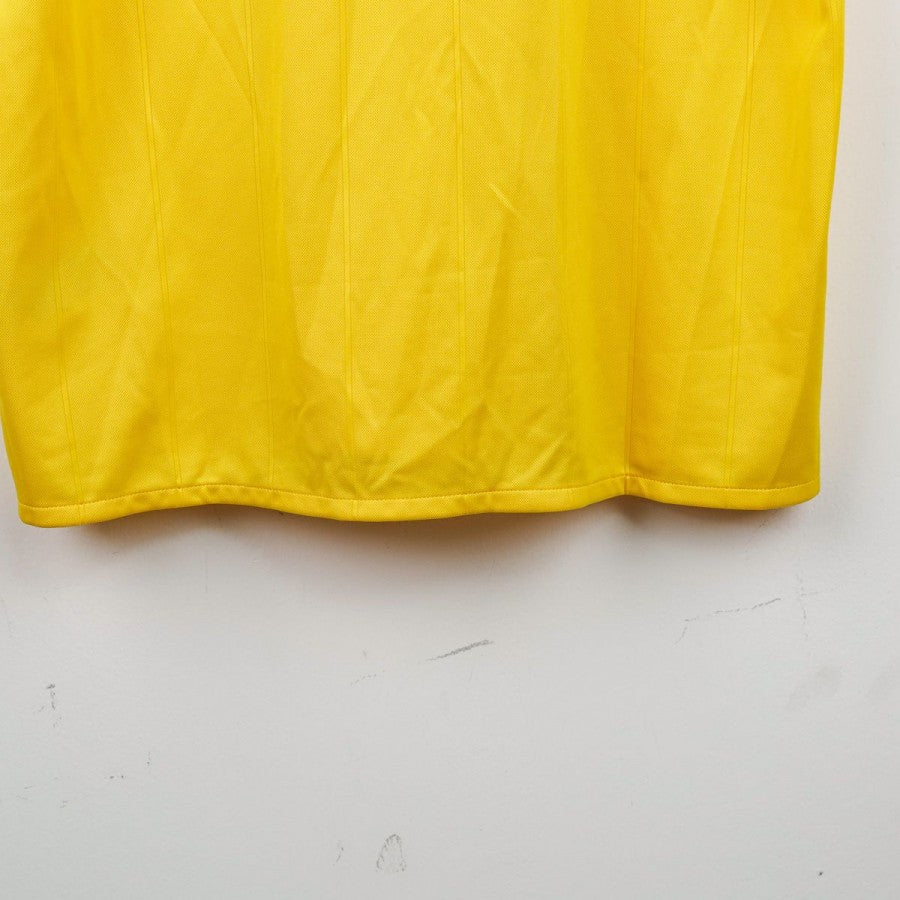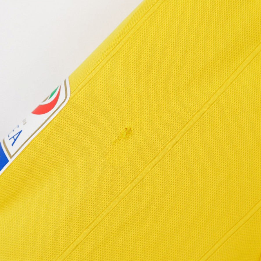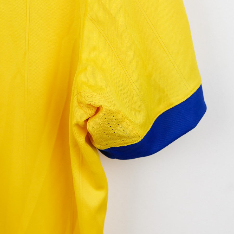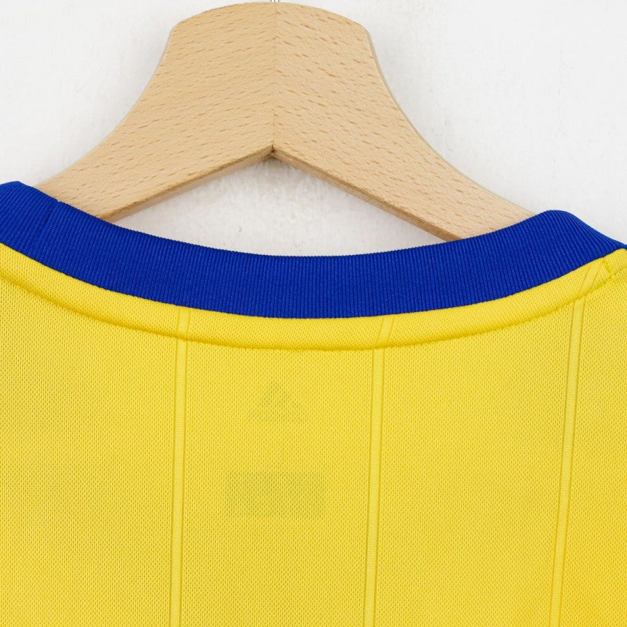 Juventus away shirt from the 2017/2018 season made by Adidas. The technical sponsor Adidas is featured on the chest along with the commercial sponsor Jeep. A Serie A sleeve patch is applied on the left arm. The shirt stands out for its bold gold and royal blue design, with three stars above the club crest to commemorate the 30 Serie A titles. Size L with original tag still attached.