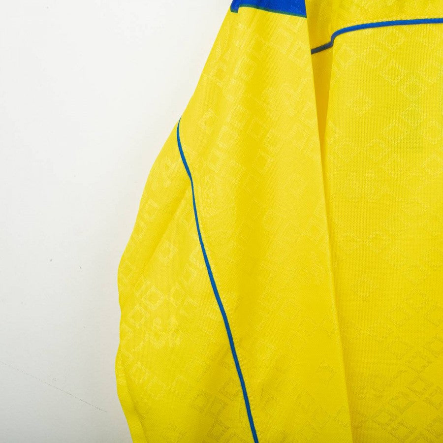 Juventus away shirt from the 1992/1993 season made by Kappa. Yellow color with blue details on shoulders, collar, and cuffs. Central Danone sponsor printed, embroidered Kappa logo, and two embroidered stars on the chest. Blue polo collar with two-button closure. Geometric pattern with sublimated Juventus crest across the fabric. Size XL. Official Kappa product, historical Juventus technical supplier in the 1990s.