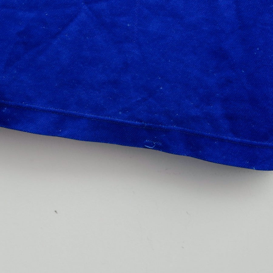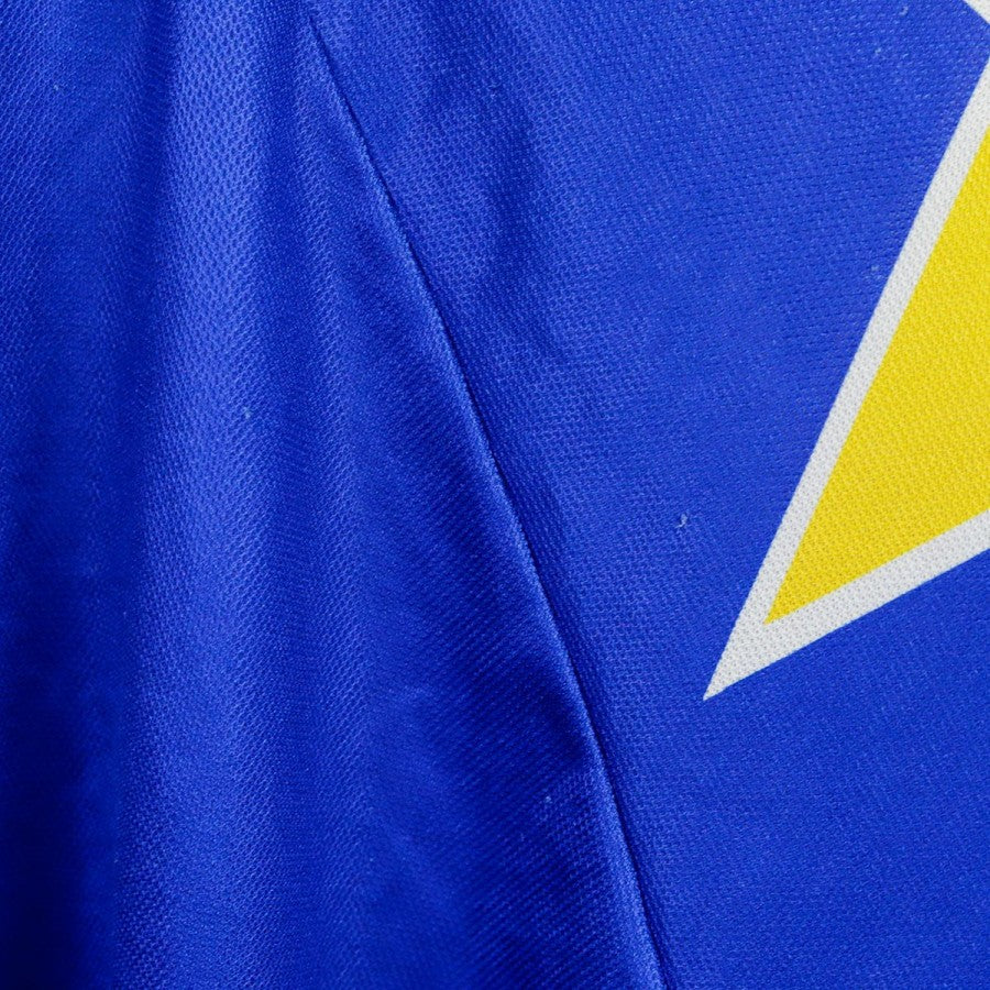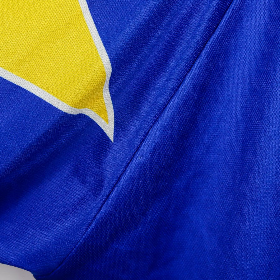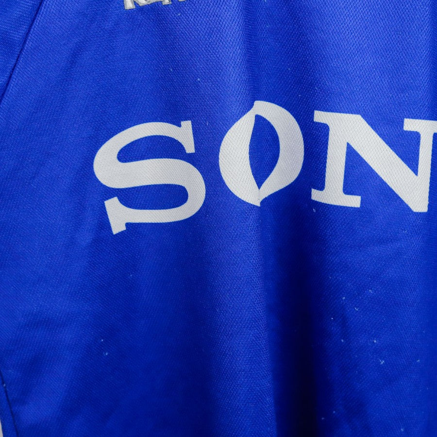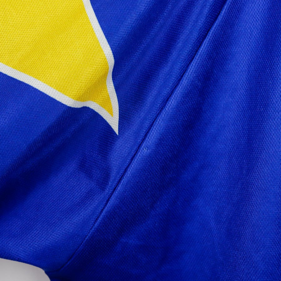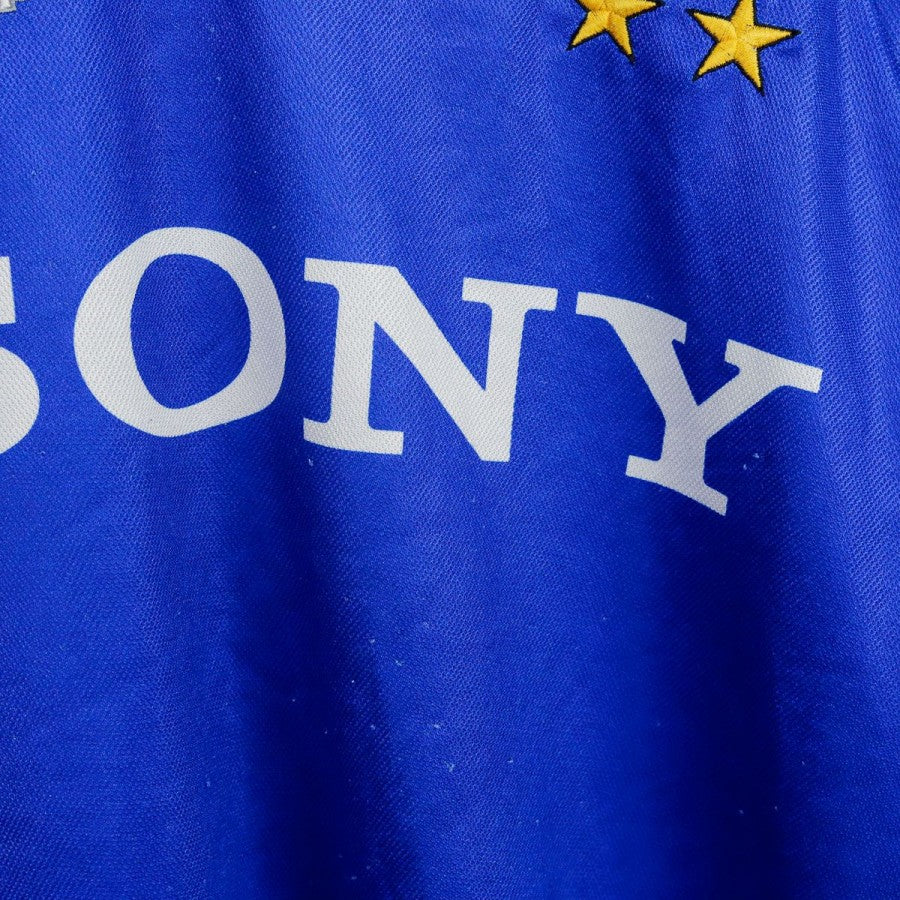 Official Juventus away jersey from the 1995/1996 season, produced by Kappa. The design features a striking blue base with yellow star-shaped details on the shoulders and sleeves. The polo collar is accented with yellow trims, while the Kappa logo is embroidered on the right chest. On the left, the Juventus crest with two stars sits proudly, symbolizing the club’s numerous triumphs. The Sony sponsor is printed in white across the front. Made from lightweight polyester, this jersey is an essential item for collectors and football fans.