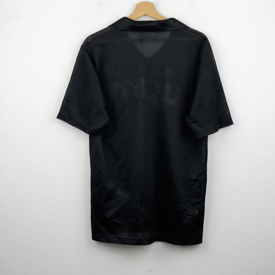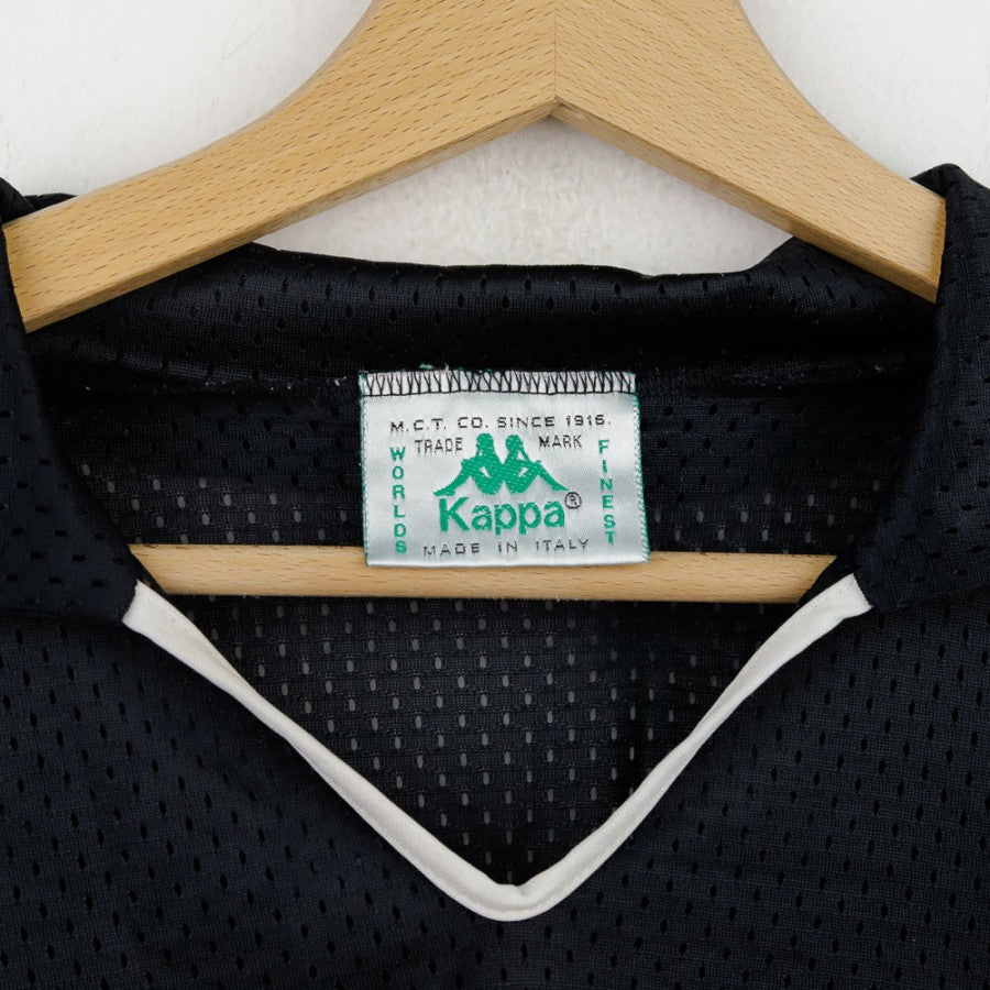 1990/1991 Away Juventus Shirt Kappa Upim. This away shirt from the 1990/1991 season stands out with its sleek black mesh body and white V-neck trim. The front showcases the Kappa logo and the commercial sponsor Upim, while the scudetto with two stars celebrates the club's legendary honors. Size XL.