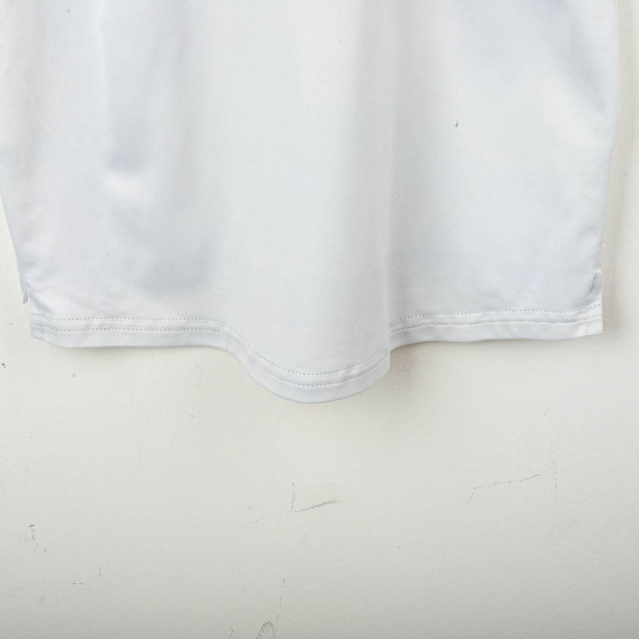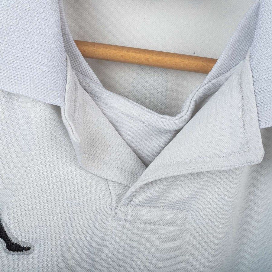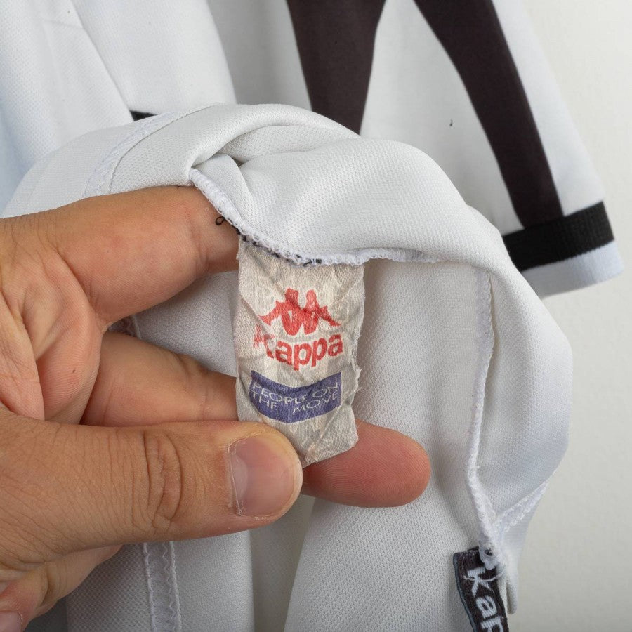 Juventus away shirt from the 1998/1999 season, made by Kappa for the “Kappa Gara” line. White base with black geometric pattern on the sleeves. Embroidered Kappa logo on the chest and stitched Juventus crest with two stars on the sleeve. Sublimated “D+ Libertà Digitale” front sponsor. Zidane name and number 21 printed on the back in the official font. Tight fit. Size S.