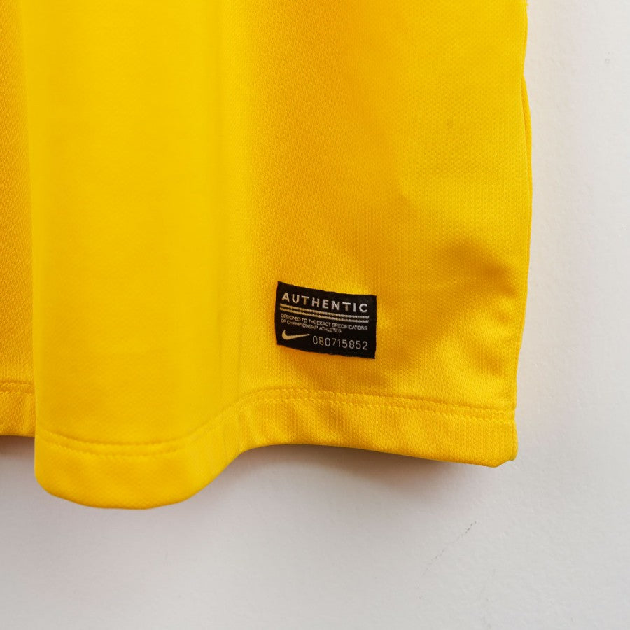 This Juventus jersey, produced by Nike for the 2013/2014 season, was the team's away kit for that year. The design features a vibrant yellow color with black and white details on the polo collar and sleeves. The right chest features the Nike logo, while the left side displays the Juventus crest. The commercial sponsor Jeep is printed in the center. The back showcases "Tevez" and the number 10 in black.