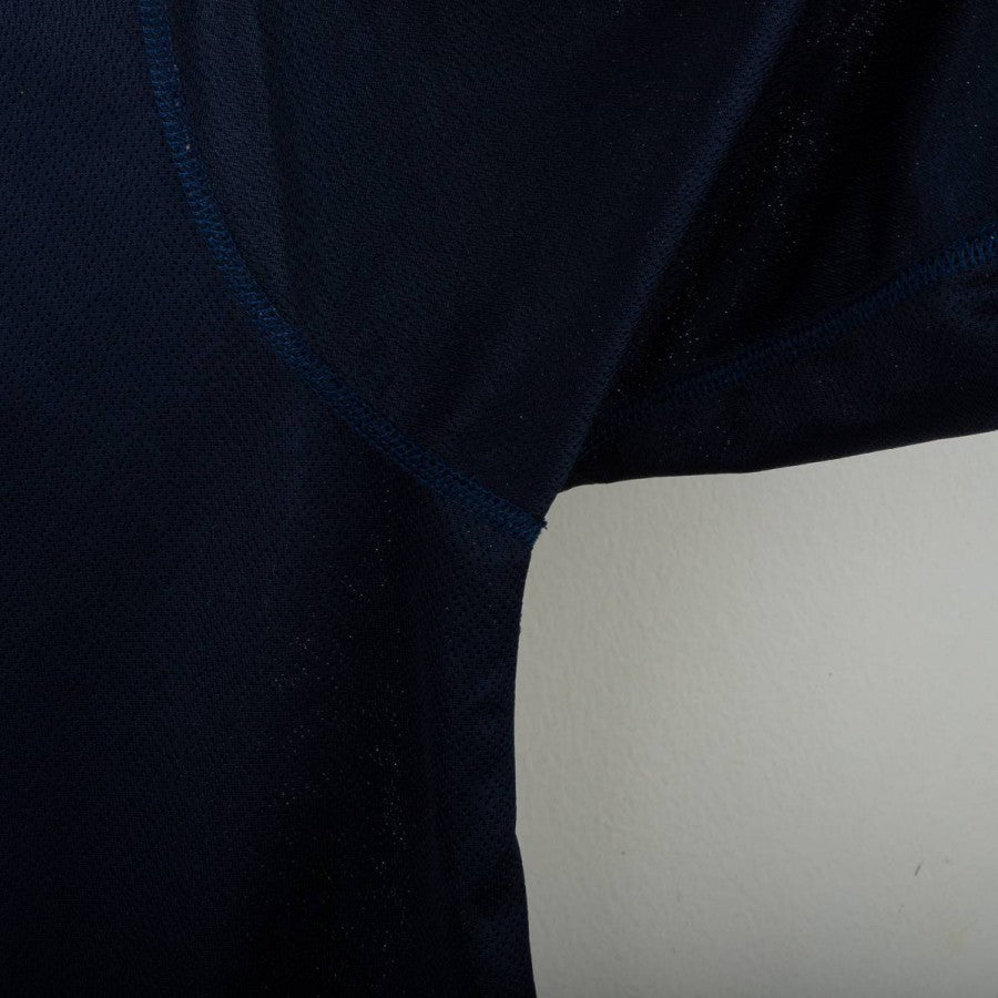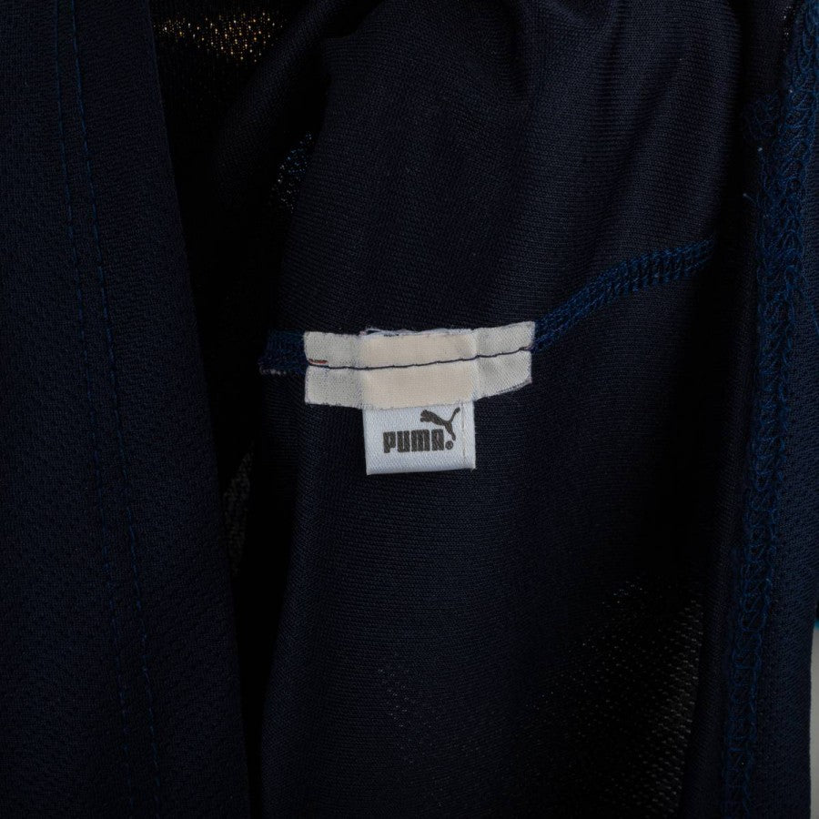 Lazio away shirt from the 2002/2003 season, made by Puma. Dark blue with light blue details on collar and sleeve edges. Light blue embroidered Puma logo on the right chest, stitched Lazio crest on the left. Siemens Mobile sponsor printed in white and red on the front. On the back, “Mihajlovic” name and number 11 in white. Regular fit. Size M.