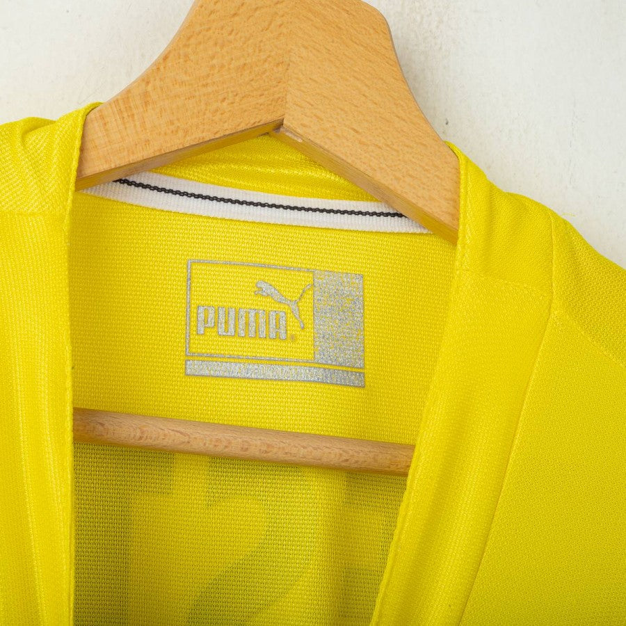 Lazio away shirt from the 2001/2002 season, made by Puma. Yellow with light blue mesh side inserts. Black embroidered Puma logo on the right chest, stitched Lazio crest on the left. Siemens Mobile sponsor printed in green, red, and black on the front. On the back, “Nesta” name and number 13 in black. Regular fit. Size not specified. Original match shirt from the season with Alessandro Nesta as Lazio’s captain and defensive leader.