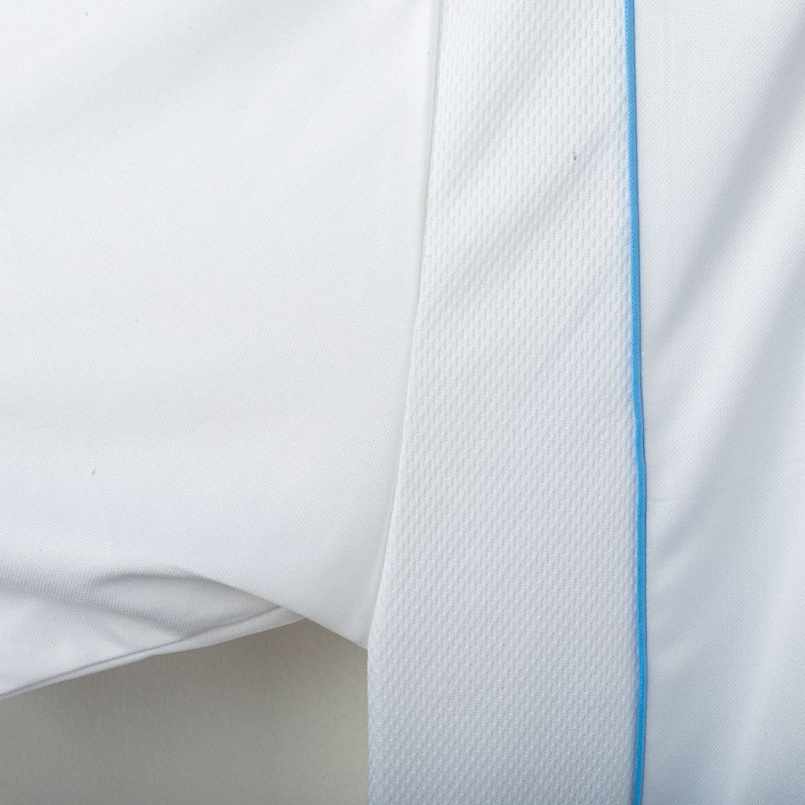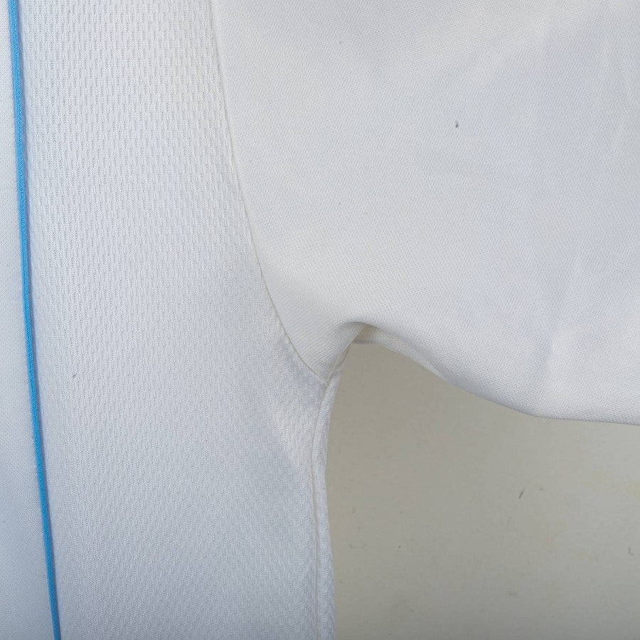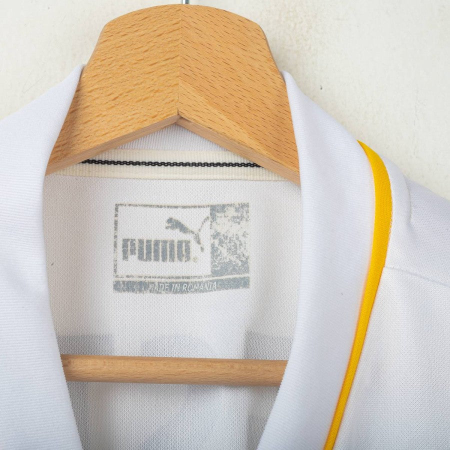 S.S. Lazio away shirt from the 2001/2002 season, made by Puma. White with light blue pinstripes and yellow trim on collar and sleeve edges. Black Puma logo embroidered on right chest and sleeves. Lazio crest stitched on left chest. Central “Siemens Mobile” sponsor printed on front. “Nesta” name and number 13 on the back in black flock with white outline. Regular fit, short sleeves, lightweight technical fabric. Size L. Original vintage product.