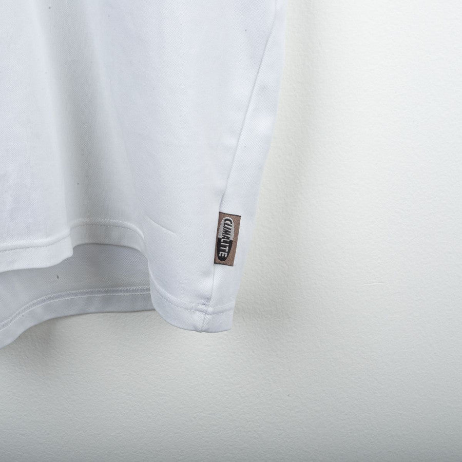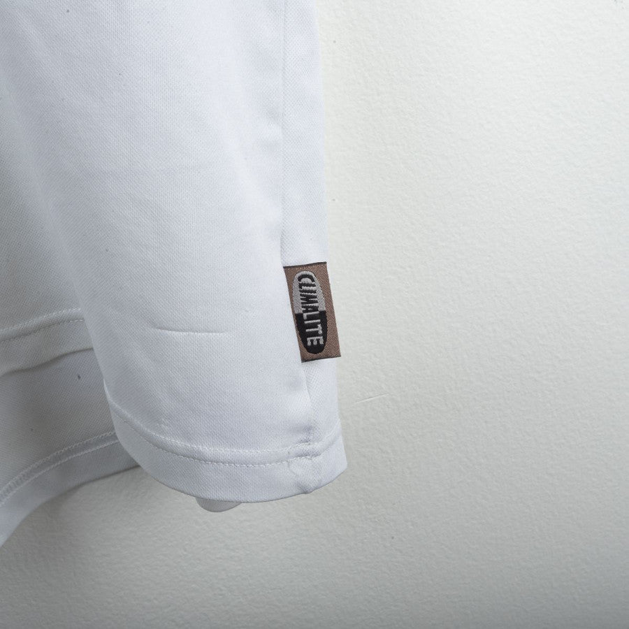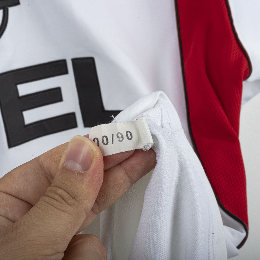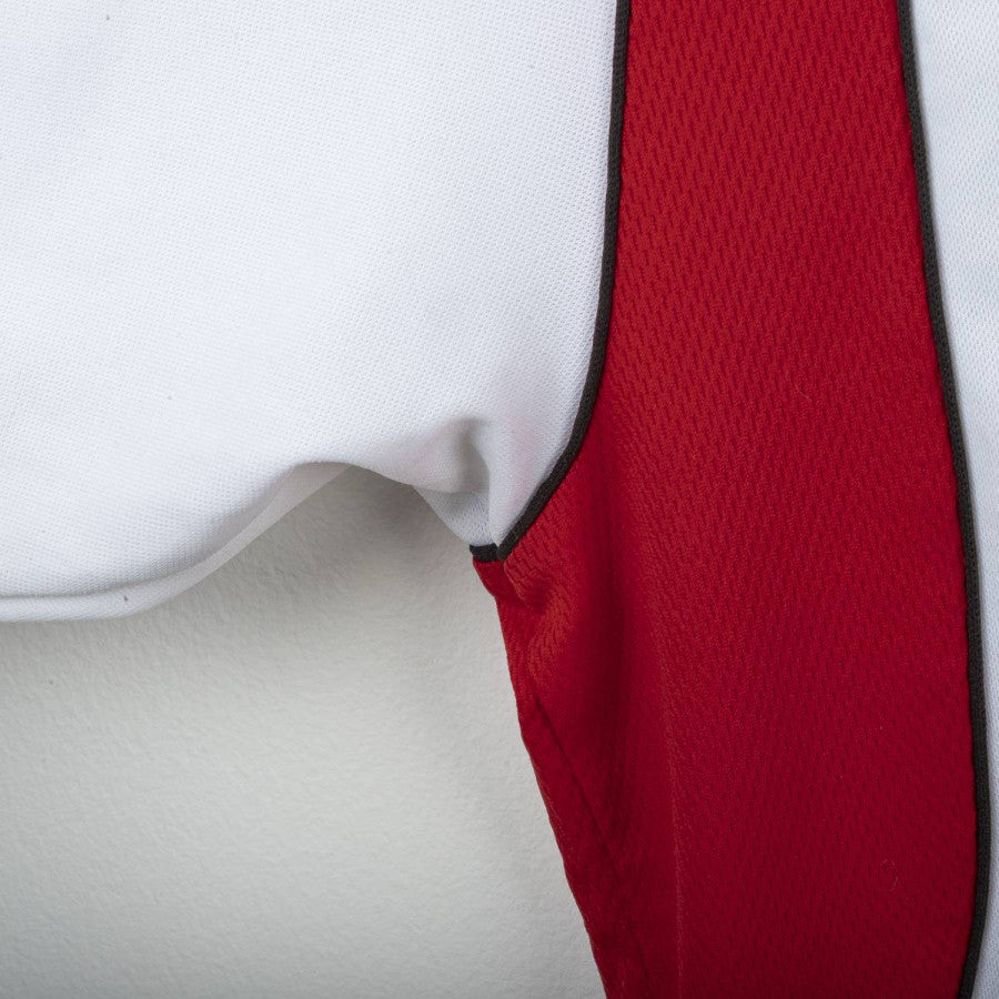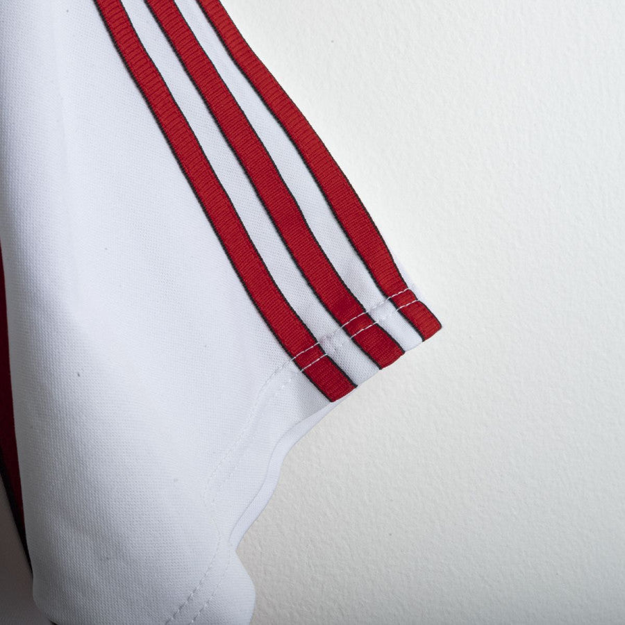 AC Milan away shirt from the 2001/2002 season, made by Adidas. White design with red inserts on sides and shoulders. White polo collar with V opening. Embroidered Milan crest on the left chest and black stitched Adidas logo on the right. Black flock Opel sponsor printed on the chest. Maldini name and number 3 printed on the back in black with red outline. Classic cut, regular fit. Size L.