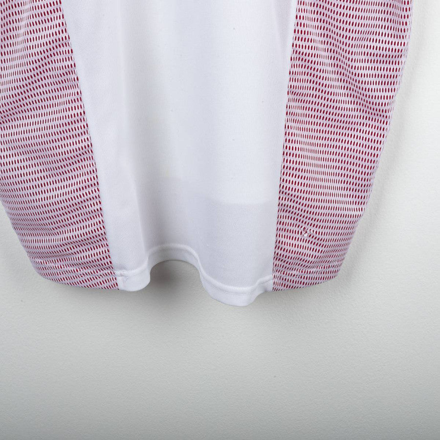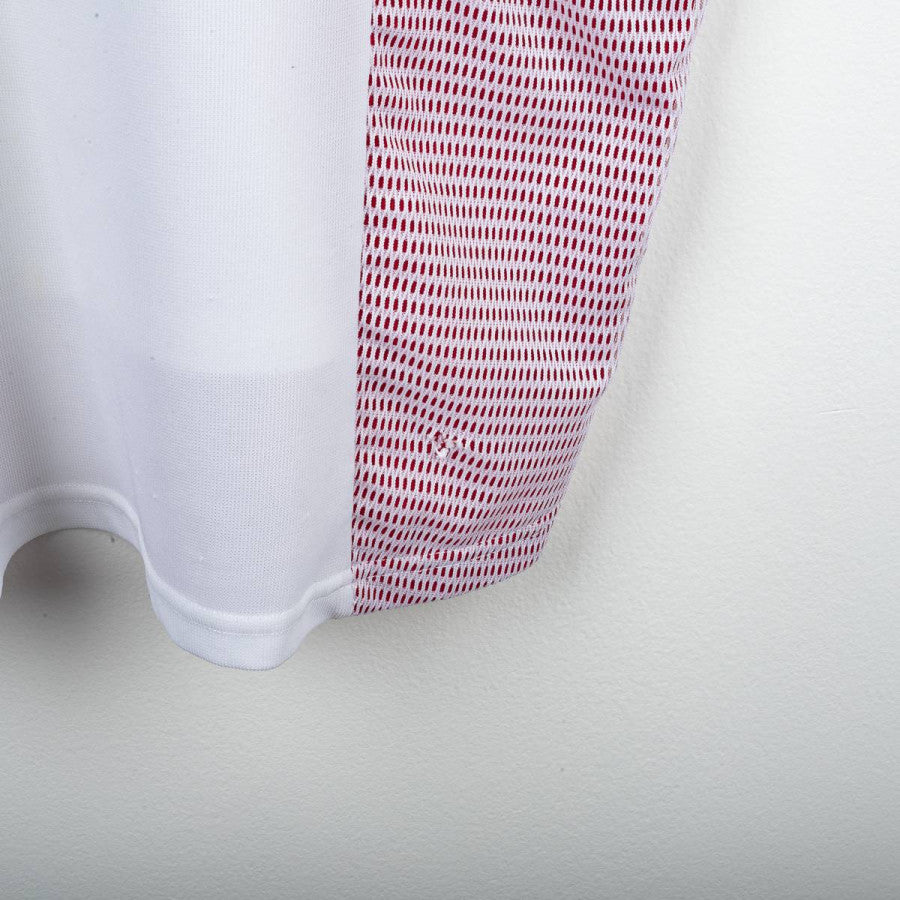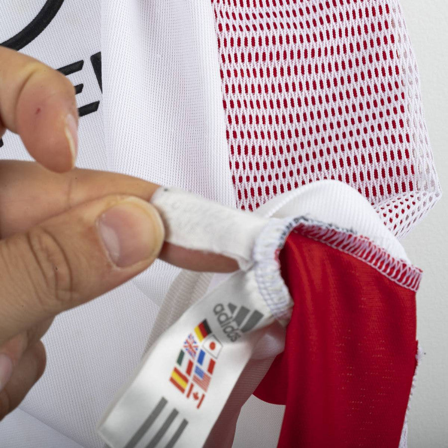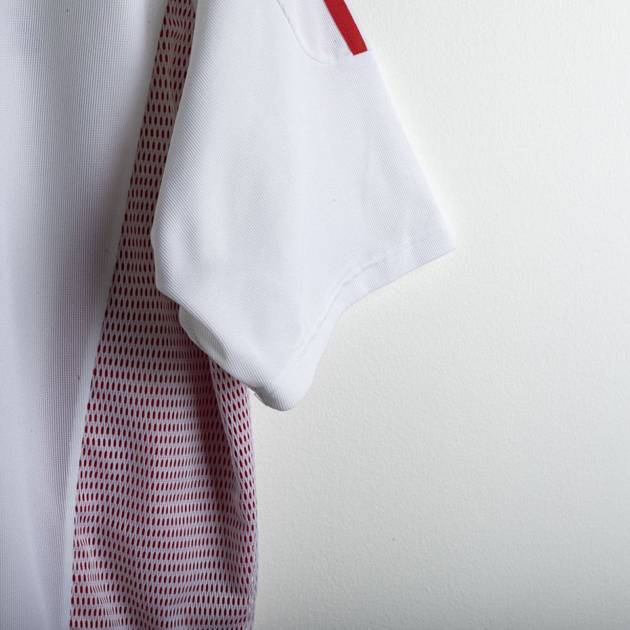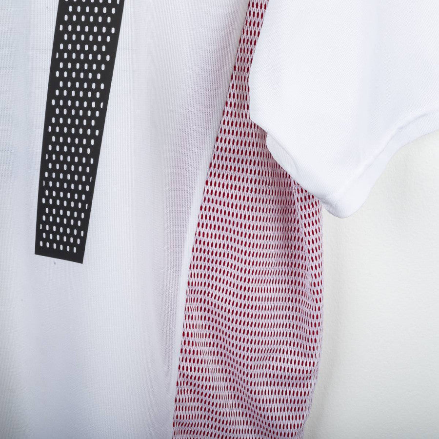 AC Milan away shirt from the 2002/2003 season, made by Adidas. White design with red and black details on collar and shoulders, mesh side inserts. Embroidered Milan crest with golden star on the left chest, Adidas logo stitched on the right. Opel sponsor printed on the front. Rivaldo name and number 11 printed in black on the back. V-neck collar. Regular fit. Size L.