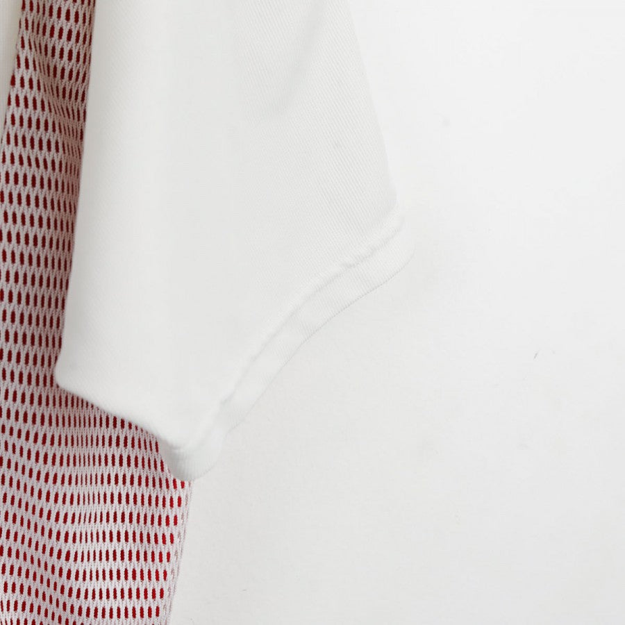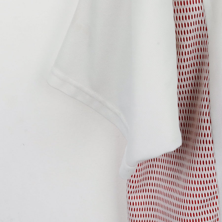 AC Milan away shirt made by Adidas for the 2002/2003 season, worn by striker Andriy Shevchenko. White base with red collar and side mesh inserts. Features the Adidas logo, AC Milan crest, and Opel sponsor on the chest. Shevchenko name and number 7 on the back. Size not specified.