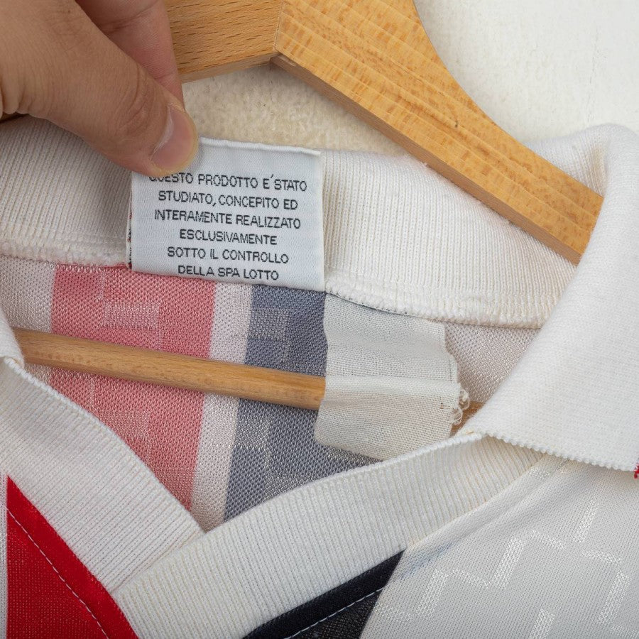 AC Milan away shirt from the 1995/1996 season, made by Lotto. White with tonal geometric pattern and central red and black vertical stripe. White polo collar with red and black trim. Embroidered Lotto logo on the right chest, stitched Milan crest with gold star above on the left. Opel sponsor in sublimated print on the front. Short sleeves with contrasting red and black cuffs. Regular fit. Size XL.