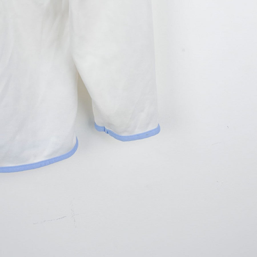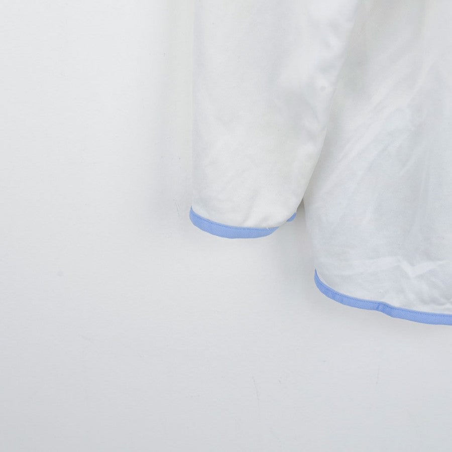 The official Napoli away jersey for the 2006/2007 season, produced by renowned technical sponsor Diadora, is white with light blue details for an elegant design. The club crest is embroidered on the chest, alongside the commercial sponsor Lete in red at the center. The number 8 is featured on the back, commemorating a pivotal season for Napoli fans. This jersey is a size L, perfect for collectors and football history enthusiasts.