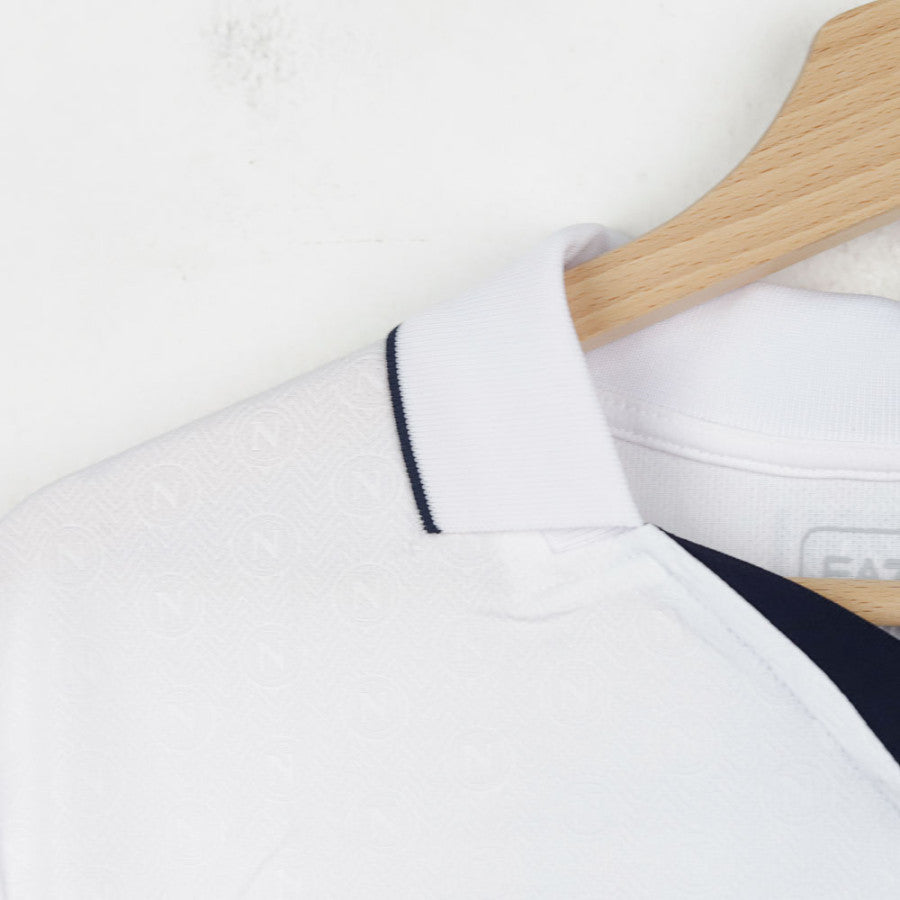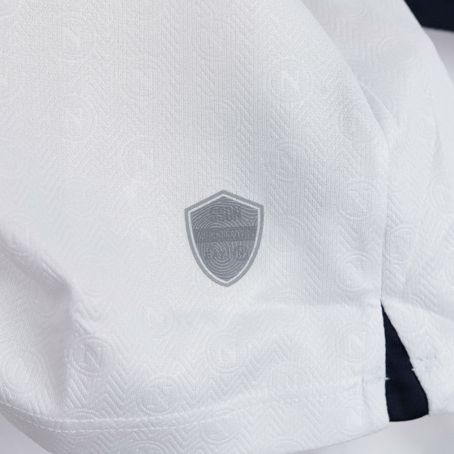 Official Napoli Away jersey for the 2024/2025 season, produced by technical sponsor EA7. This model features an elegant design with a white base and dark blue details. The chest displays the EA7 logo on the right, while the monochromatic Napoli crest and MSC commercial sponsor stand out at the center. The back is customized with the name Neres and number 7, along with the secondary sponsor Sorgesana. The Serie A official patch is present on the sleeve. Size M.