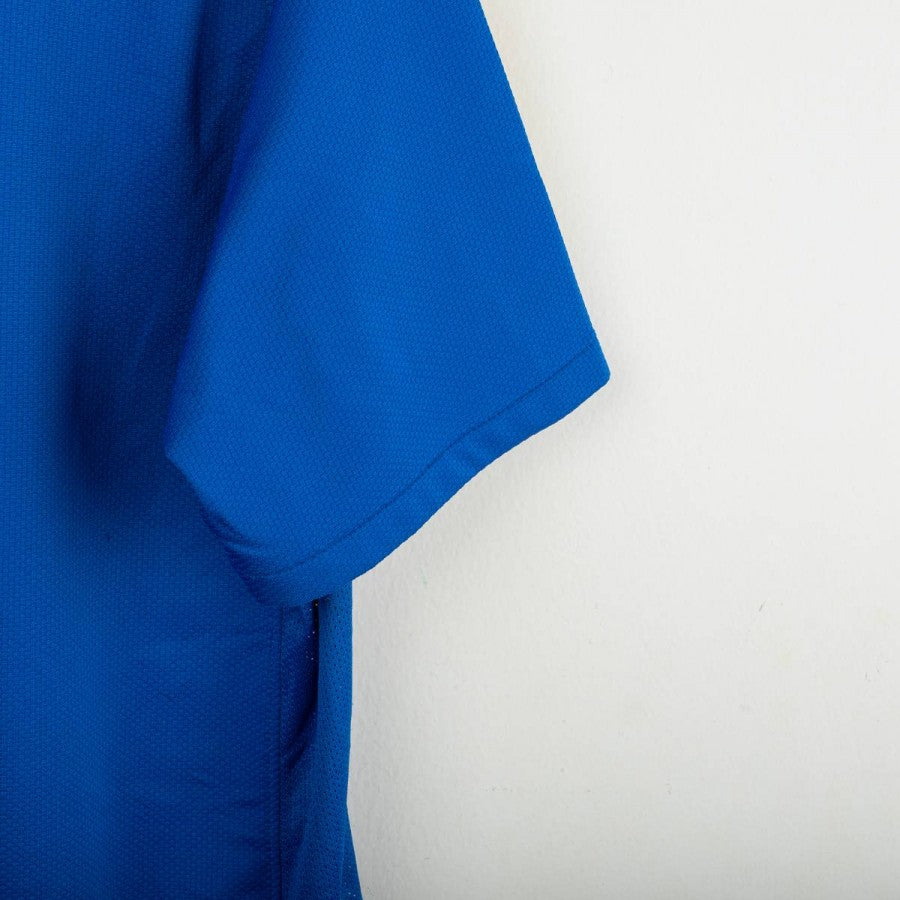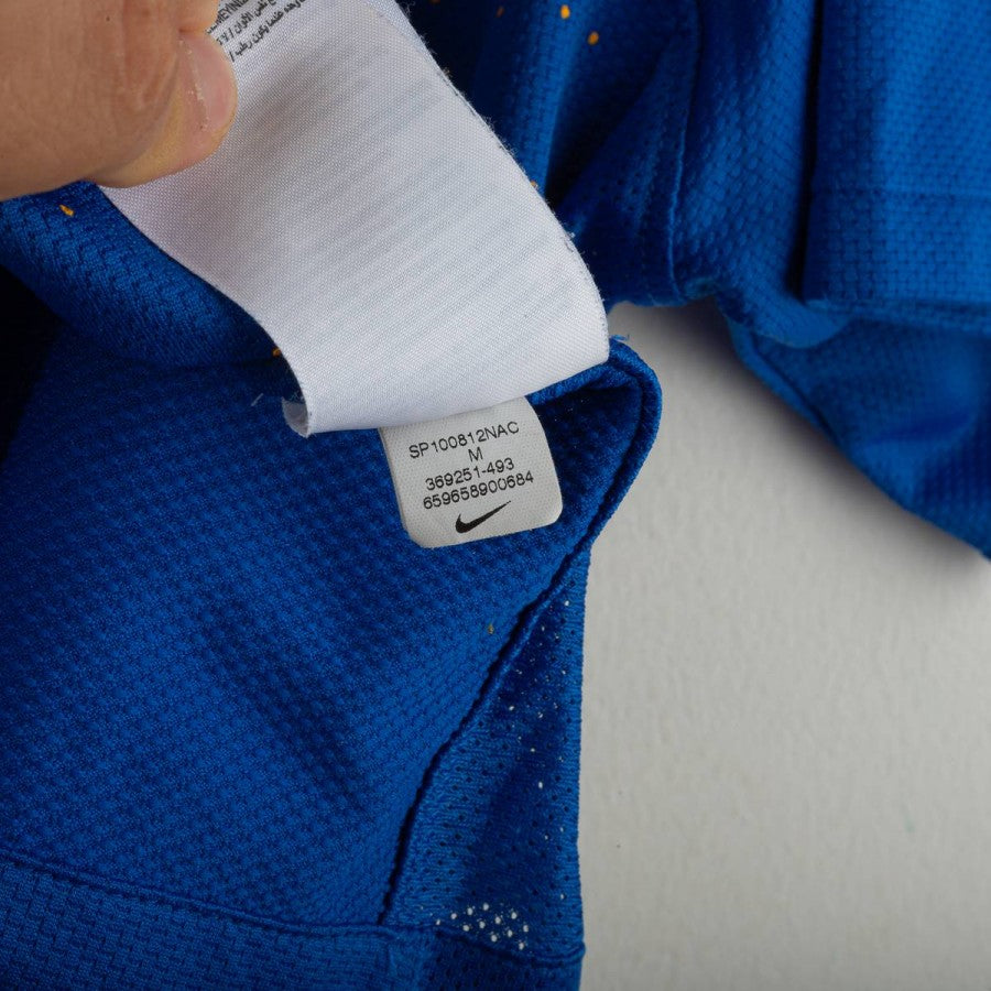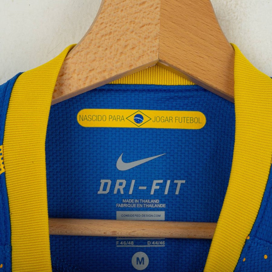 Brazil away shirt from the 2011/2012 season, made by Nike. Official version in blue with yellow details on collar and sleeves. Embroidered CBF crest with five stars above on the left chest, white embroidered Nike logo on the right chest. "Brasil" printed under the back collar. Made of Nike Dri-FIT lightweight and breathable fabric with perforated panels for improved ventilation. Size M.