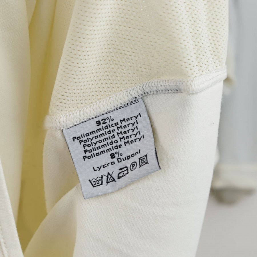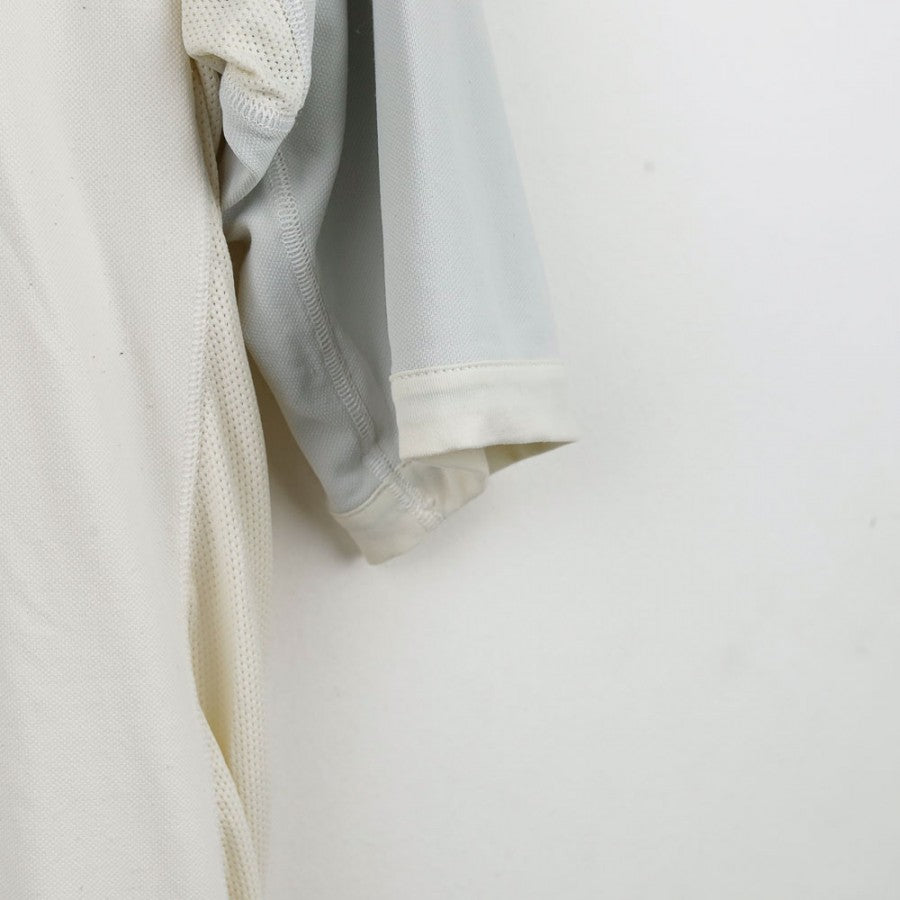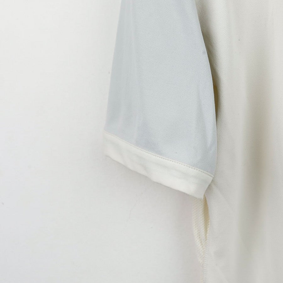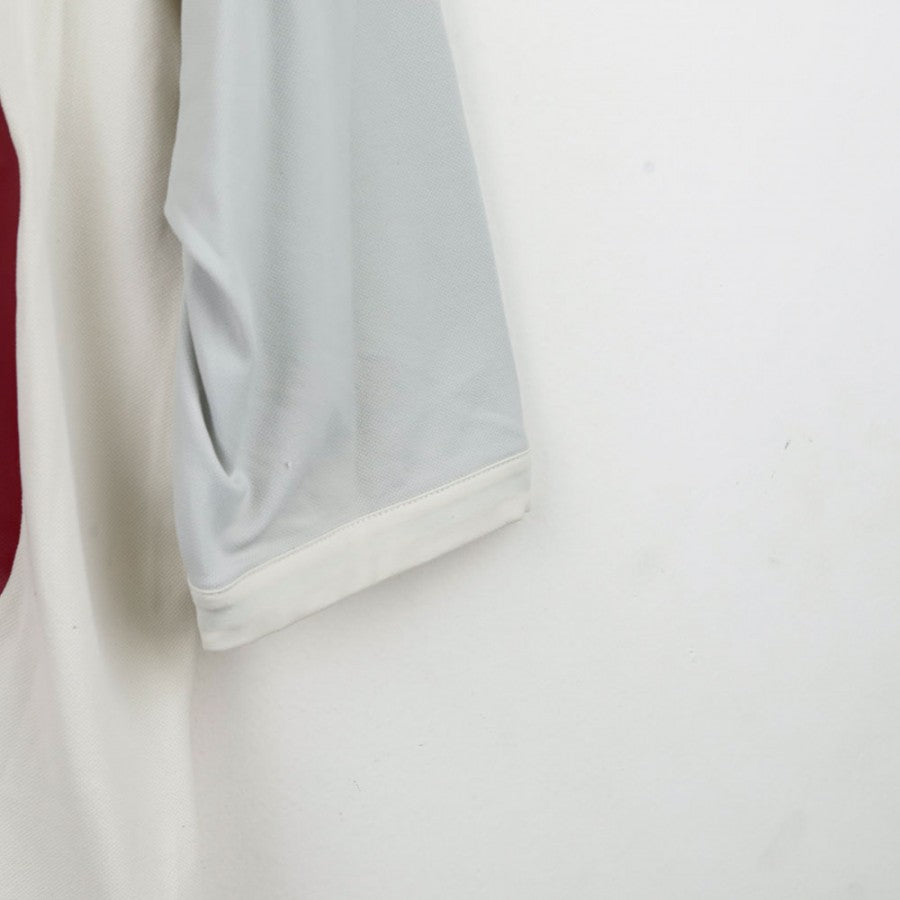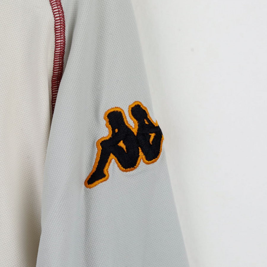 2002/2003 Away Roma Shirt Totti 10. The away kit for the 2002/2003 season features a refined ivory body with pearl grey sleeves and burgundy red stitching. The Kappa technical sponsor is displayed on the chest and sleeves, with the AS Roma crest proudly positioned on the chest. The back features the legendary Totti name and number 10. Size L.
