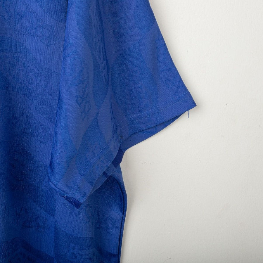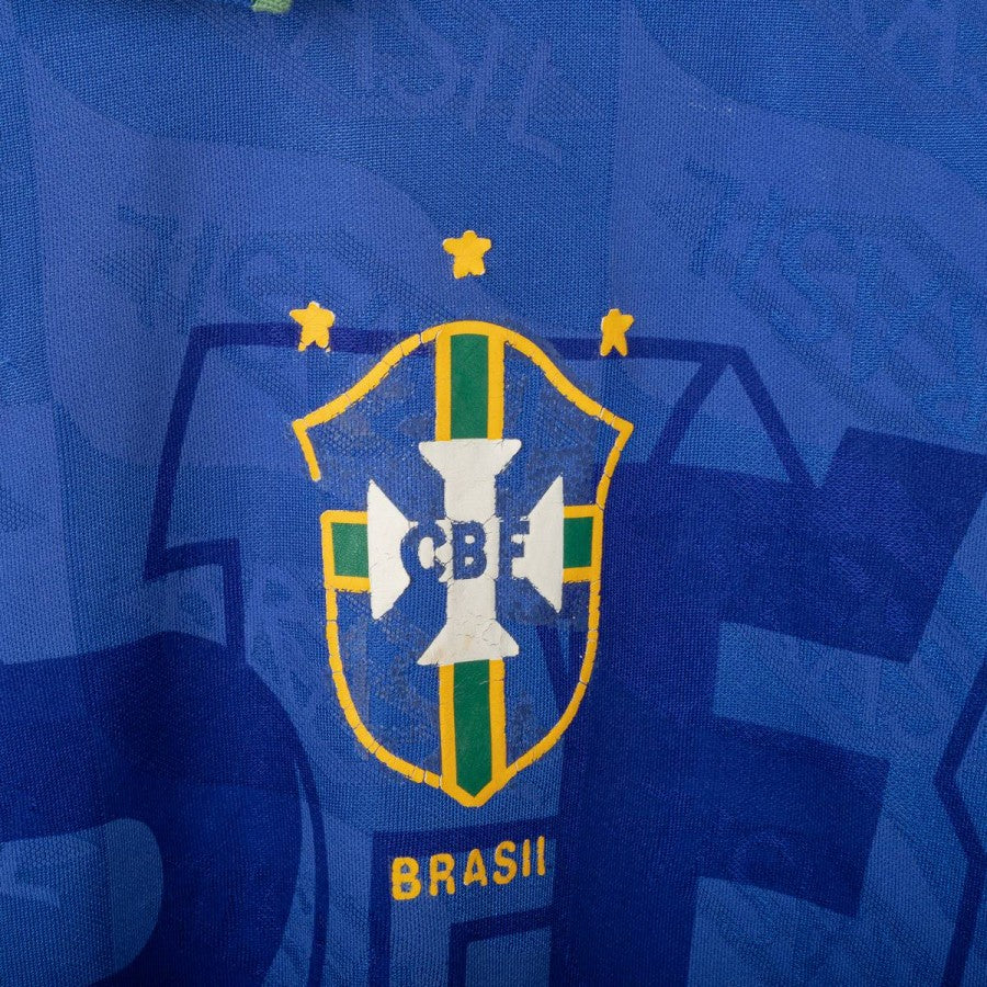 1992/1993 Away Brazil Shirt Umbro, size XL. This shirt was made by technical sponsor Umbro and features the Brazilian Football Confederation (CBF) crest on the chest, alongside the Umbro logo. Its distinctive tone-on-tone “BRASIL” pattern and retro collar with green and blue detailing make it a true classic from the early 1990s.