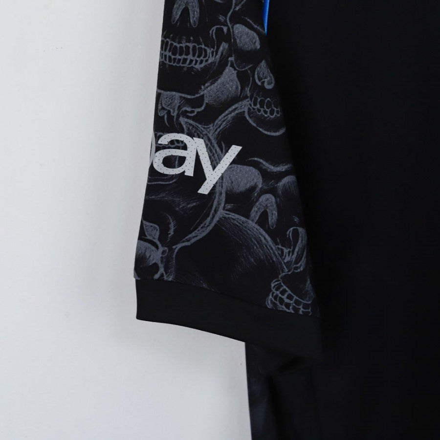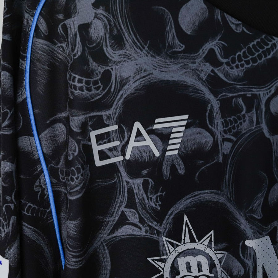 Official Napoli Fourth jersey from the 2023/2024 season, produced by technical sponsor EA7. This special edition features a bold black design with skull-themed graphics and light blue details. The chest showcases the Napoli crest with the tricolor scudetto, the EA7 logo, and main sponsor MSC. The right sleeve carries the official Serie A TIM 2023/2024 patch. Personalized with the name and number of star striker Victor Osimhen, number 9, in blue with a gradient effect. Size XXL.