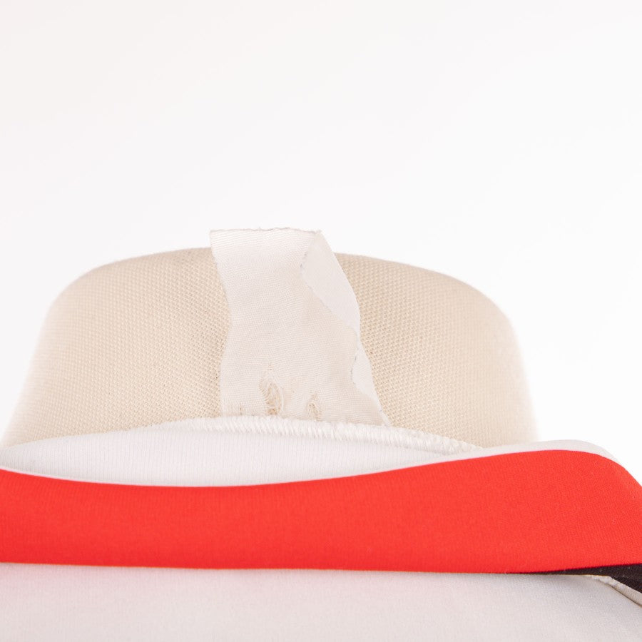 White model with contrasting red and black details, long sleeves with polo collar and V-neck, some knitwear details. Commercial sponsor Motta in sublimatic, Adidas crest in sublimatic.