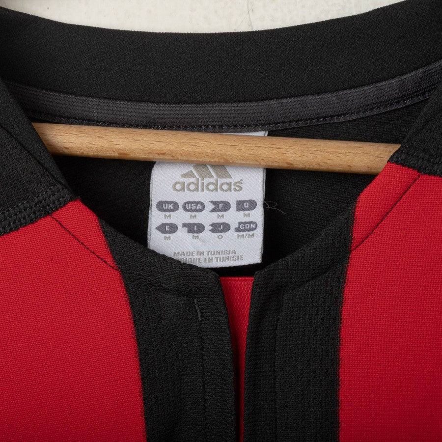 Official AC Milan home shirt from the 2003/2004 season, made by Adidas. Featuring the iconic red and black vertical stripes, it includes short sleeves and a round collar. The front shows the Adidas logo, Italian Scudetto badge, Opel Meriva commercial sponsor, and the club crest with a gold star. On the back, the name Kaká and number 22 are applied in the season’s official white perforated font. Size M.