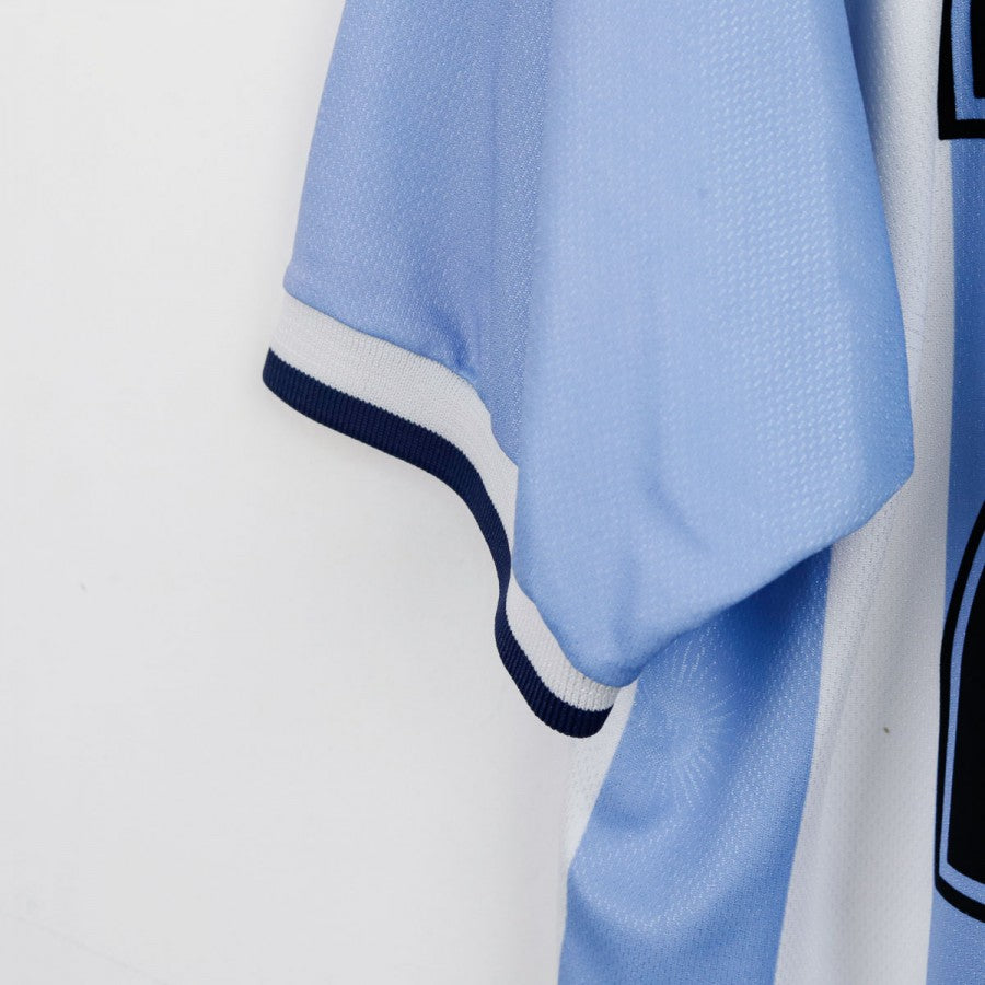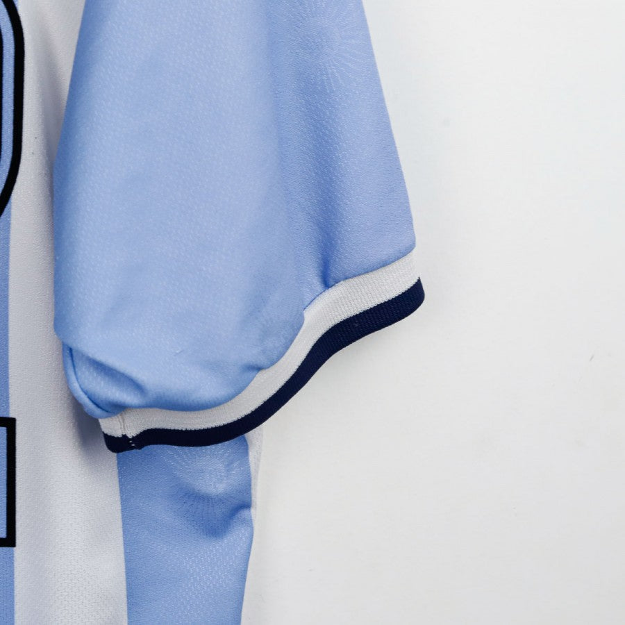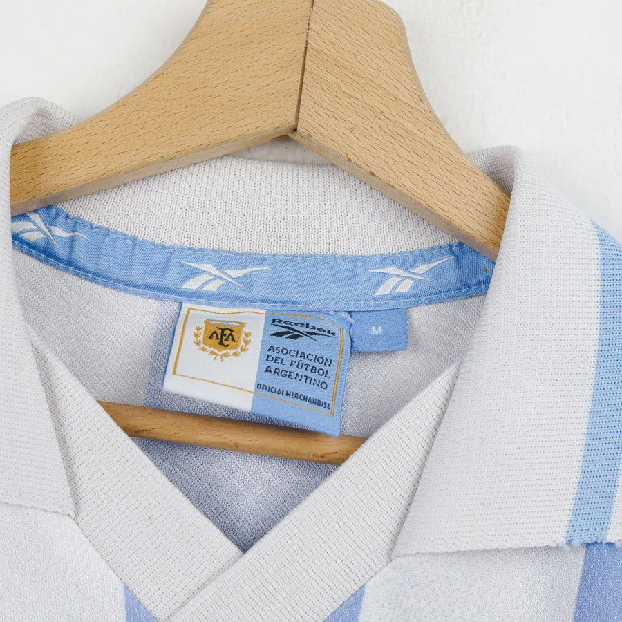 1999 Home Argentina Shirt Reebok Riquelme 22 made by technical sponsor Reebok, featuring the classic white and sky blue stripes and number 22 on front and back. The Argentine federation crest appears on the chest alongside the brand logo. Size M.