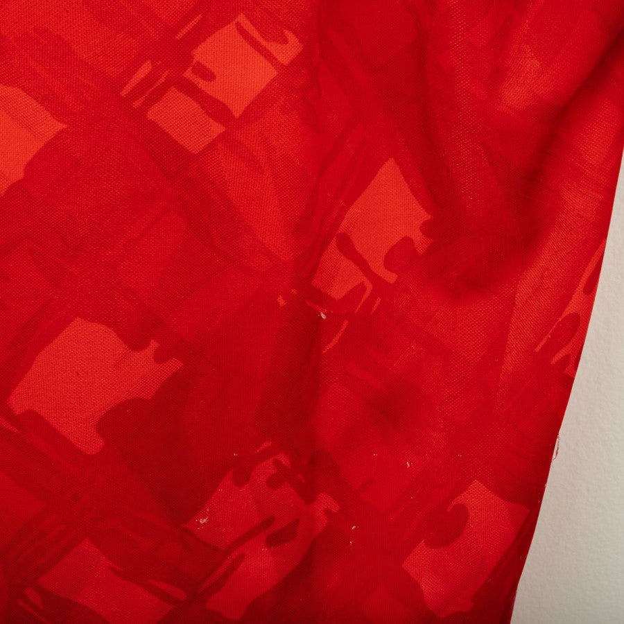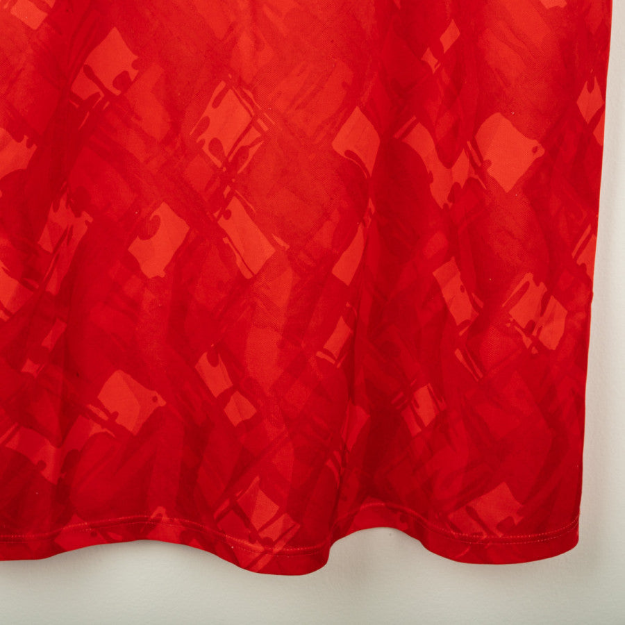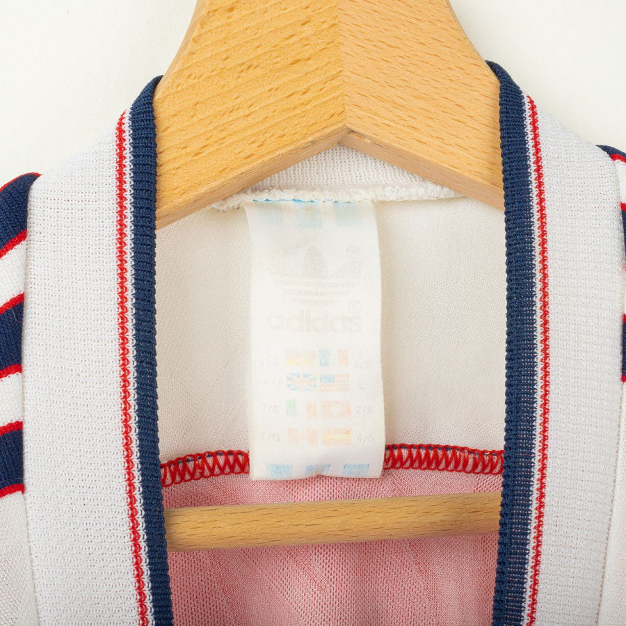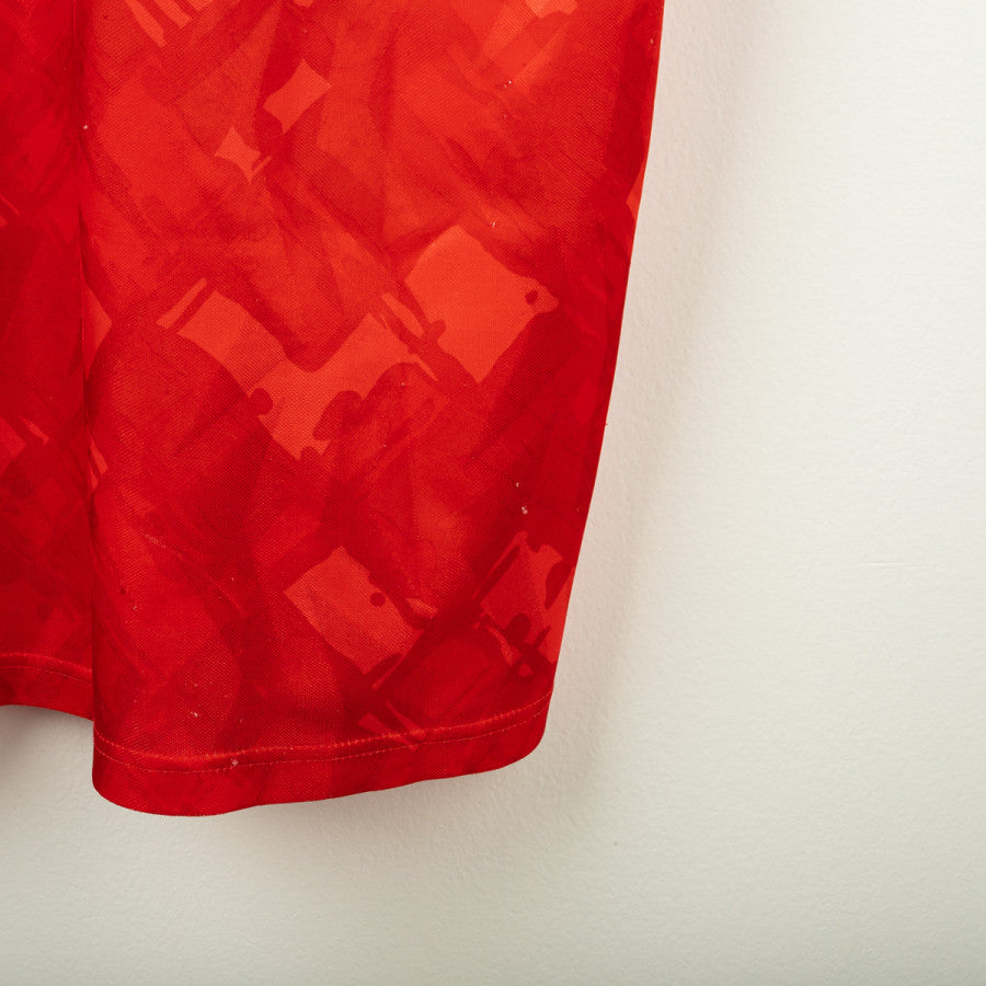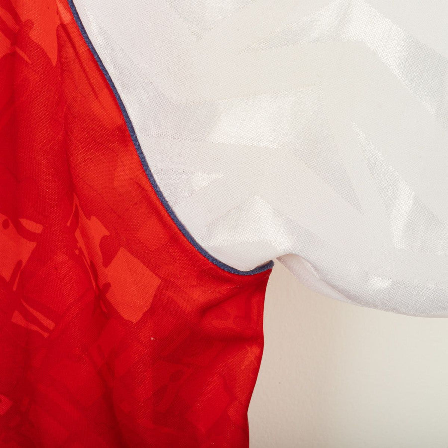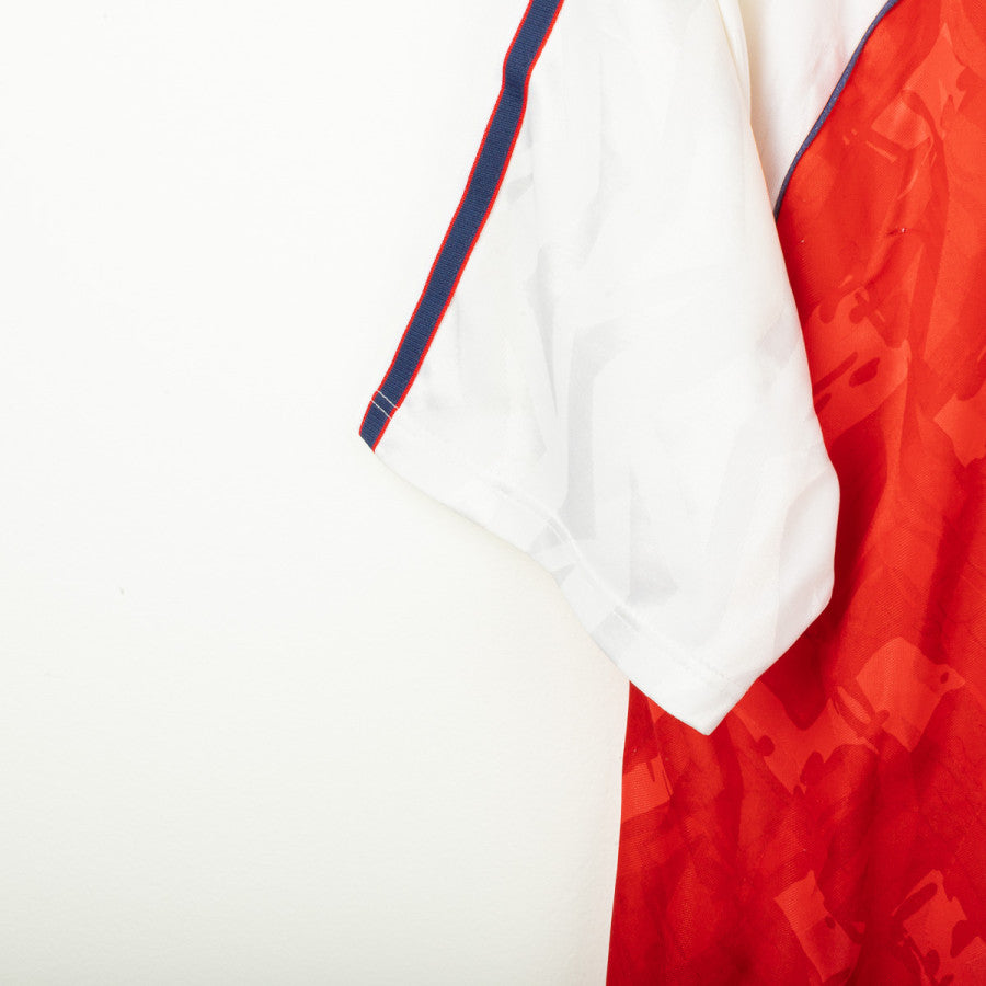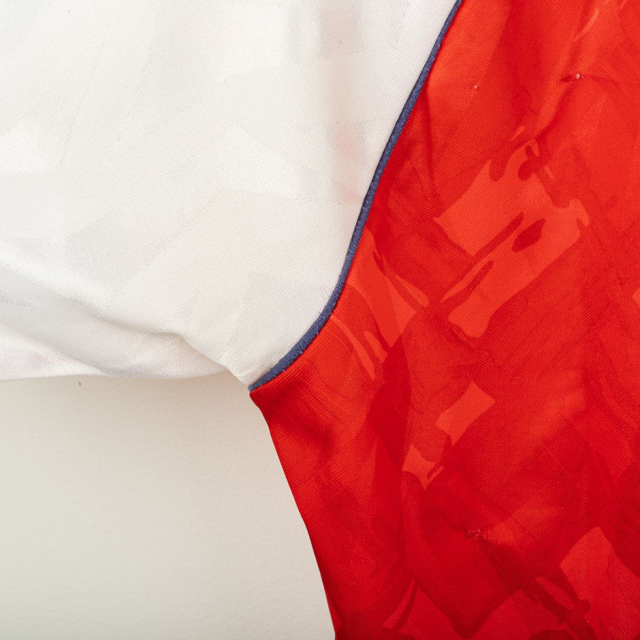 Arsenal home shirt from the 1992/1993 season, made by Adidas. Classic red body with white sleeves and navy details. Embroidered Adidas Trefoil logo on the right chest, printed Arsenal crest on the left, and white flock JVC sponsor at the center. Ribbed collar with red and navy stripes and “AFC” embroidery. Subtle geometric pattern on shiny polyester fabric. Regular fit. Size L.