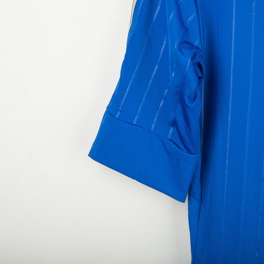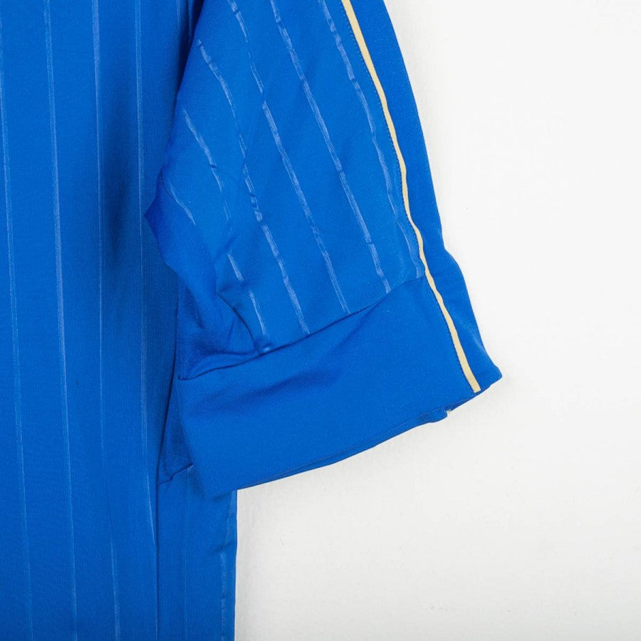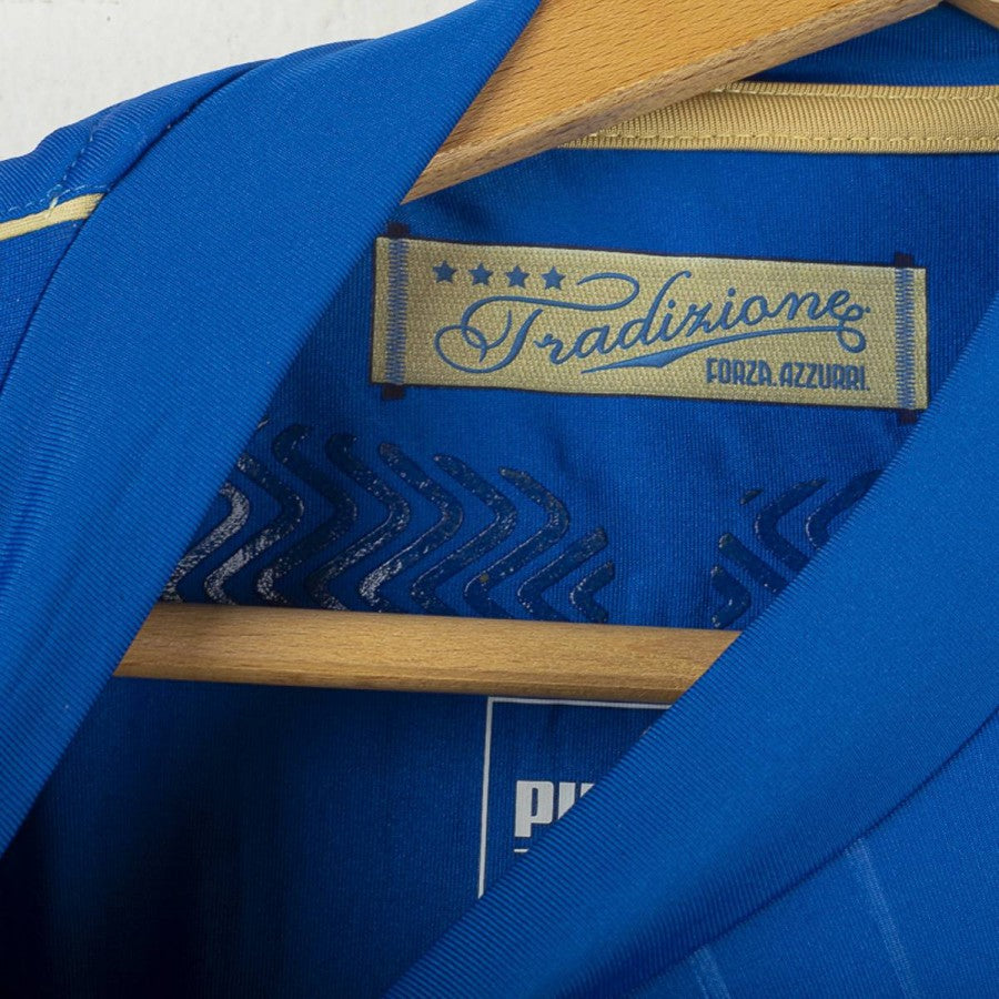 Italy home shirt from the 2016/2017 season, Authentic version made by Puma. Sky blue design with tone-on-tone vertical stripes and golden details on the shoulders. Puma logos embroidered on the chest and sleeves. FIGC crest with three stars stitched on the left chest. V-neck collar with internal tricolour detail and the words “Tradizione – Forza Azzurri”. Back with Insigne name and number 7 in white print with golden outline. Slim fit typical of the Authentic model. Size M. Official shirt worn by the Azzurri during the 2018 World Cup qualifiers.