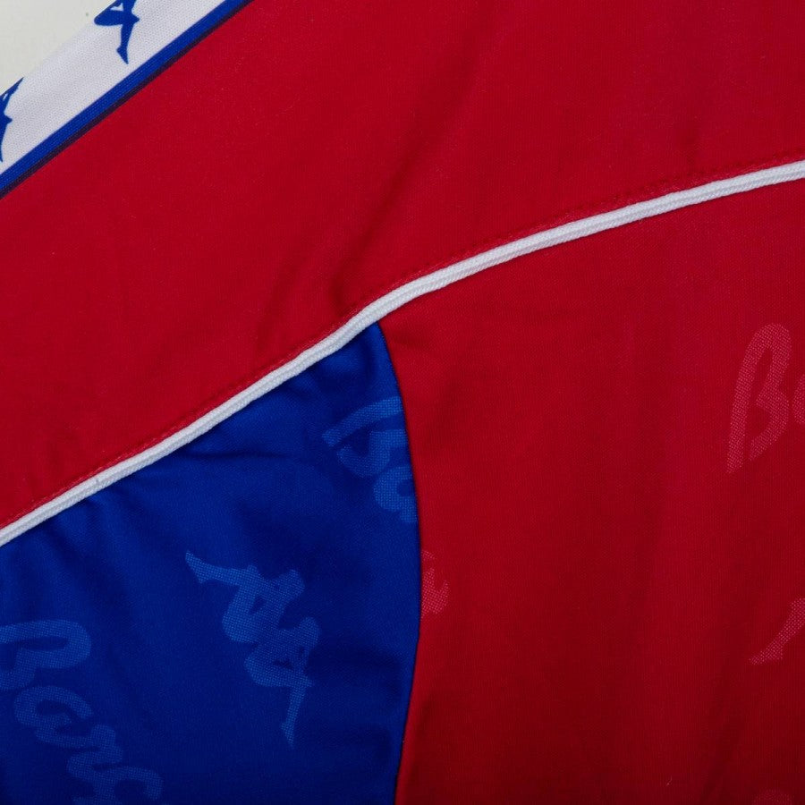 Official FC Barcelona home shirt made by Kappa for the 1993/1994 season. Classic blaugrana design with vertical red and blue stripes, purple polo collar and white shoulder inserts. Embroidered Kappa logo on the right chest and stitched FCB crest on the left. Sleeve tape featuring repeated Kappa logos in white. All-over tonal “Barça” and Kappa jacquard pattern. Lightweight, breathable polyester fabric. Original vintage Kappa shirt, one of the most iconic of the 1990s, worn by stars like Koeman, Guardiola, Stoichkov and Romário.