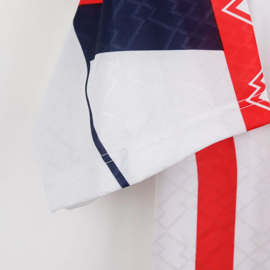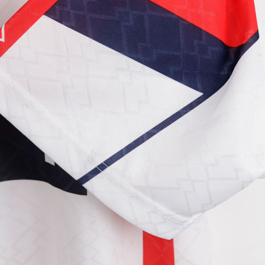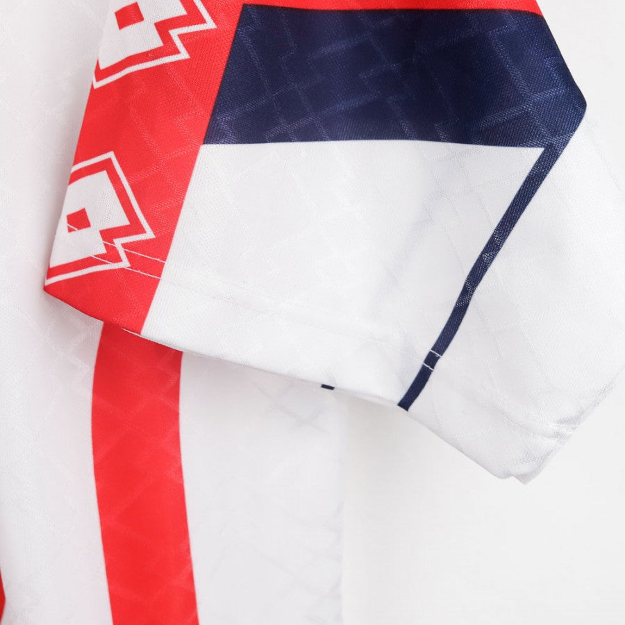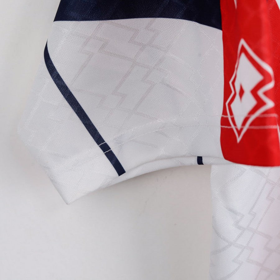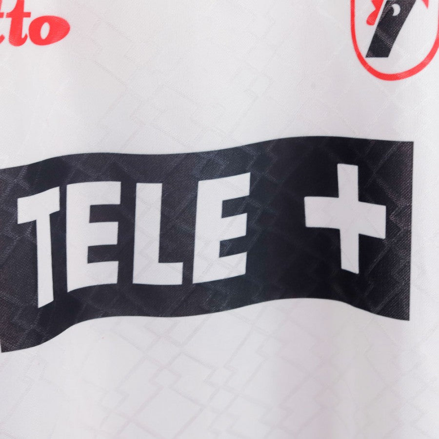Official home shirt of Bari from the 1999/2000 season, featuring Antonio Cassano’s name and number 18. Short-sleeved model in white with red and blue details on the shoulders and sides. The fabric has a subtle geometric pattern, while the classic polo collar is trimmed in red and blue. The Bari crest is applied on the left chest, with the Lotto logo on the front and repeated on the sleeves. The TELE+ sponsor is prominently displayed at the center. Size L.