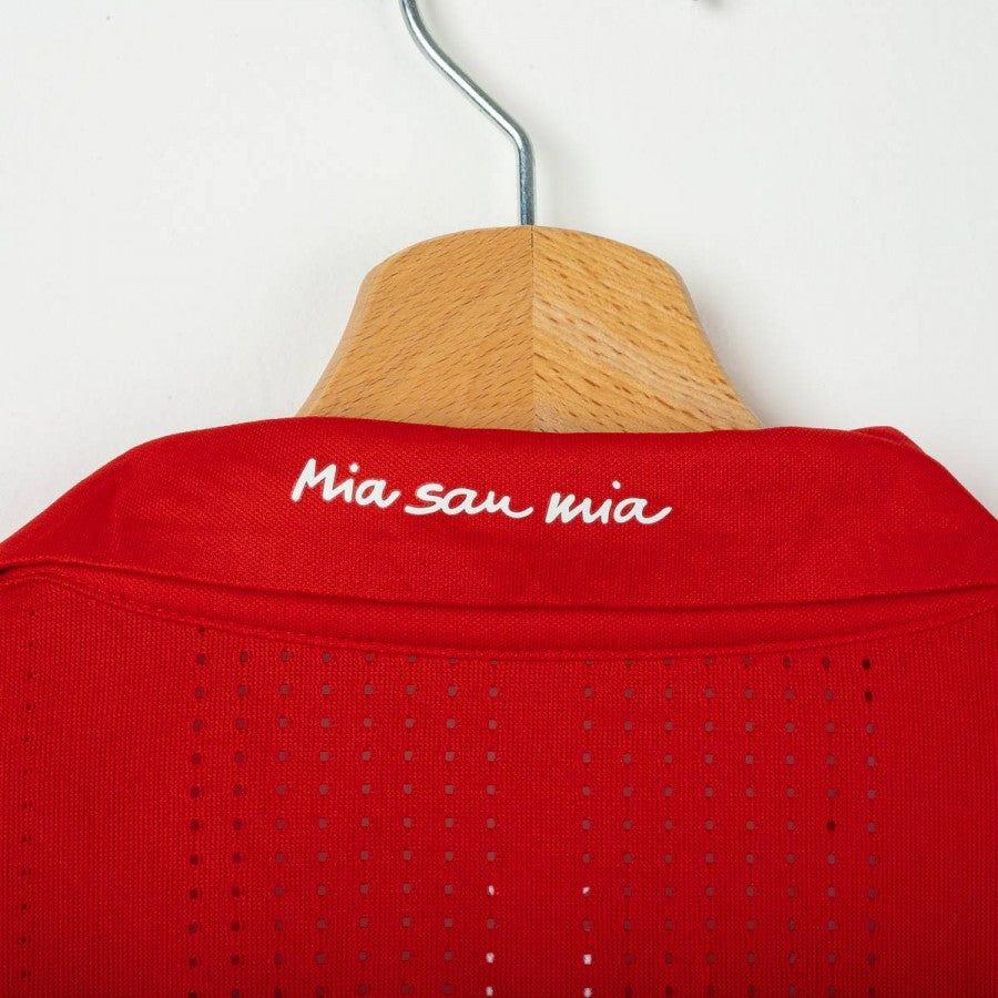 Bayern Munich Home shirt from the 2016/2017 season made by Adidas. Red model with subtle tonal horizontal stripes, white Adidas logo on the right chest and embroidered Bayern Munich crest with four stars on the left chest. Central white T-Mobile sponsor. Polo collar with buttons and white inserts. On the back, Alonso 14 in white with Bayern crest at the bottom of the numbers. Adizero lightweight technology, slim fit design.