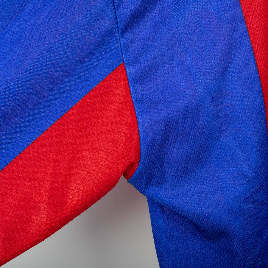 Bologna FC home shirt from the 1996/1997 season, made by Diadora. Long-sleeve version. Classic red and blue vertical stripes with blue polo collar and V-neck. Printed Diadora logo, stitched Bologna crest, and white Carisbo sponsor on the chest. Glossy 90s polyester fabric with subtle tonal pattern. Includes original Diadora “Light Your Fire” tag. Size XL.