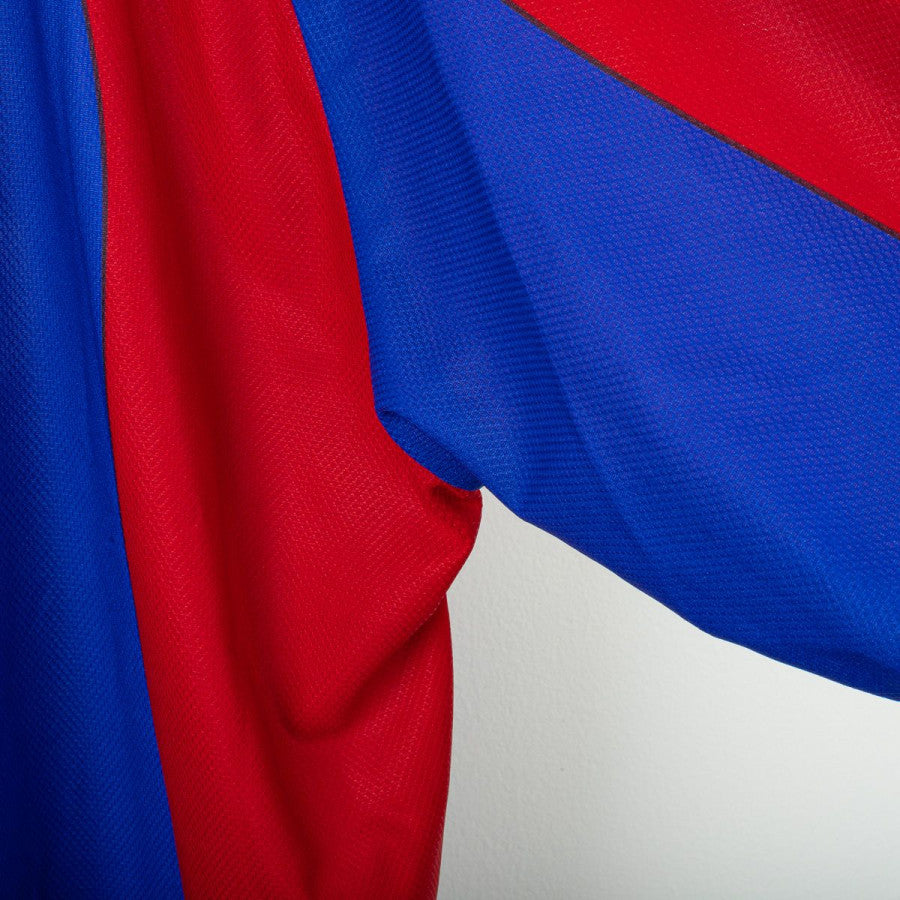 Bologna FC home shirt from the 1998/1999 season, made by Diadora. Long-sleeve version. Classic red and blue vertical stripes with blue polo collar and V-neck. Embroidered Diadora logo, stitched Bologna crest, and printed Granarolo sponsor. Subtle “BFC 1909” tonal pattern across the fabric. Made from lightweight breathable polyester, includes original Diadora tag. Size XL.